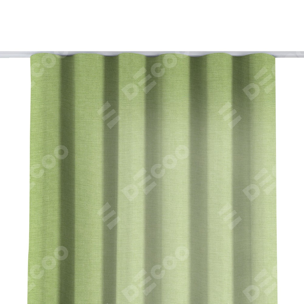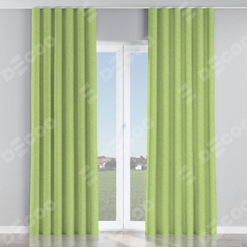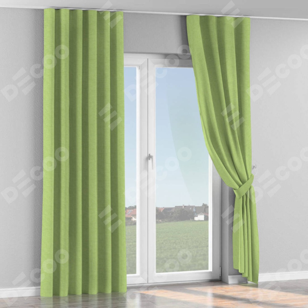 Комплект прямых штор, от производителя «Cortin», пошиты из ткани лён зелёный, артикул ткани 85906. С изнаночной стороны в верхней части штор пристрачивается шторная лента с декоративными складками «Волна». Для создания элегантных складок прямые шторы шьются по стандарту с коэффициентом 1:2 (на 100 см. ширины проёма 200 см. ширины ткани).