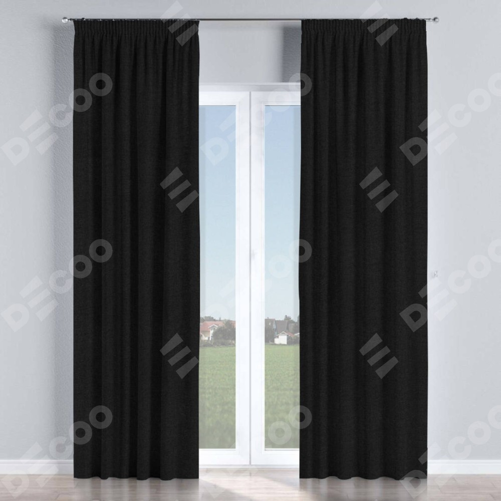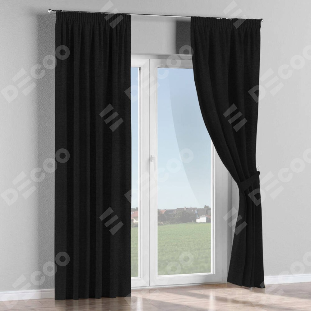 Комплект прямых штор, от производителя «Cortin», пошиты из ткани лён черный, артикул ткани 85927. С изнаночной стороны в верхней части штор пристрачивается шторная лента с декоративными складками «Карандаш». Для создания элегантных складок прямые шторы шьются по стандарту с коэффициентом 1:2 (на 100 см. ширины проёма 200 см. ширины ткани).