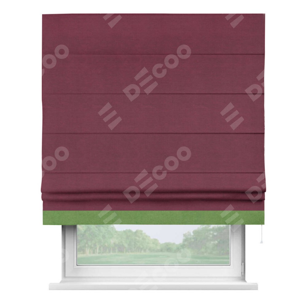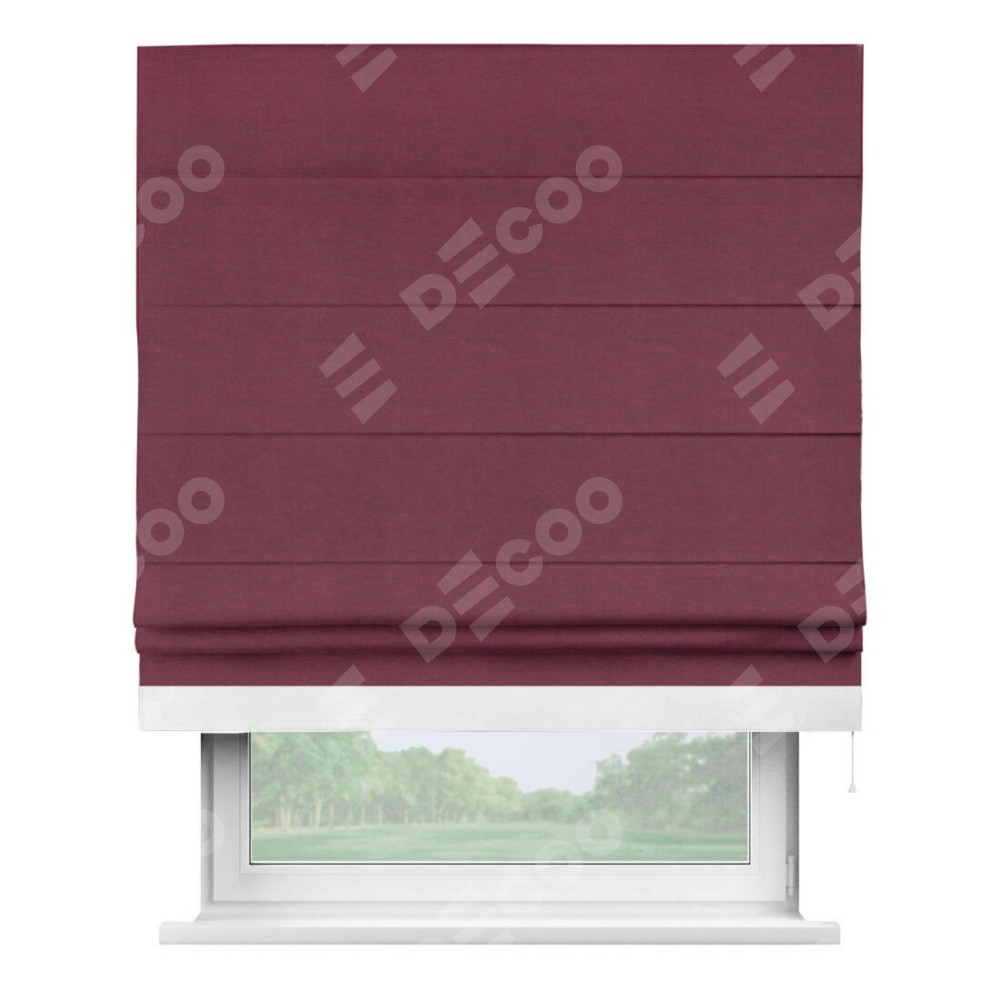Римская штора производителя «Cortin», используется для проёма, пошита из ткани вельвет бордовый, артикул ткани 85553. Отделка шторы кантом «Джестер», ткань для канта используется из вельвета разной расцветки на выбор. Имеет универсальный механизм и подходит для монтажа: на потолок, на стену и в нишу.
