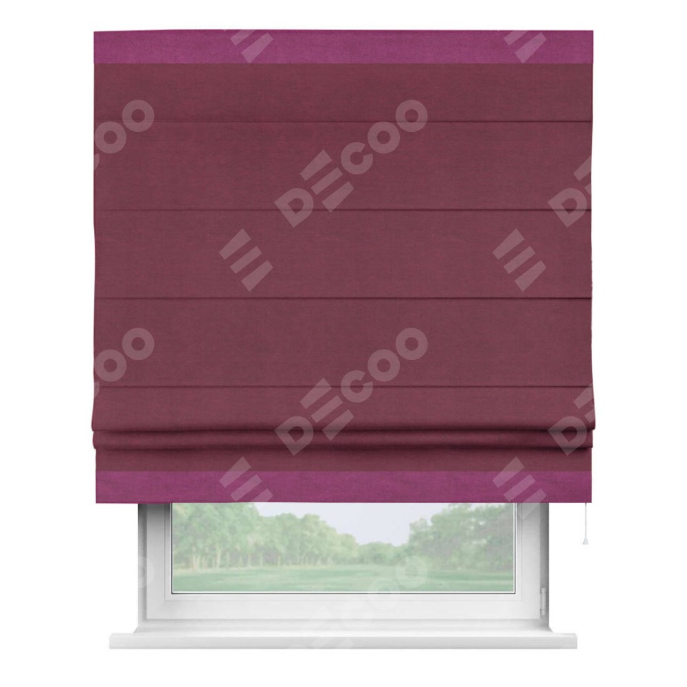 Римская штора производителя «Cortin», используется для проёма, пошита из ткани вельвет бордовый, артикул ткани 85553. Отделка шторы кантом «Горизонт», ткань для канта используется из вельвета разной расцветки на выбор. Имеет универсальный механизм и подходит для монтажа: на потолок, на стену и в нишу.