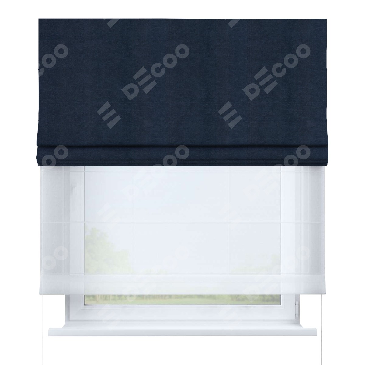 Римская штора день-ночь производителя «Cortin», используется для проёма, пошита из двух полотен, с лицевой стороны софт однотонный тёмно-синий артикул 33111, вторая ткань тюль (по стандарту комплектуется тюль белого цвета артикул V-01). Имеет универсальный механизм и подходит для монтажа: на потолок, на стену и в нишу.