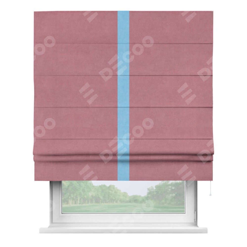 Римская штора производителя «Cortin», используется для проёма, пошита из ткани вельвет брусника, артикул ткани 85550. Отделка шторы кантом «Хайвей», ткань для канта используется из вельвета разной расцветки на выбор. Имеет универсальный механизм и подходит для монтажа: на потолок, на стену и в нишу.
