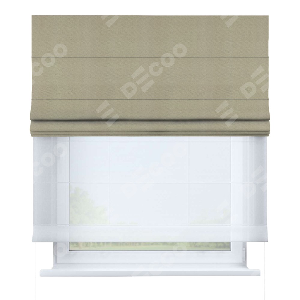 Римская штора день-ночь производителя «Cortin», используется для проёма, пошита из двух полотен, с лицевой стороны pipa блэкаут светло-бежевый артикул 02, вторая ткань тюль (по стандарту комплектуется тюль белого цвета артикул V-01). Имеет универсальный механизм и подходит для монтажа: на потолок, на стену и в нишу.