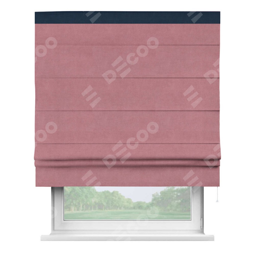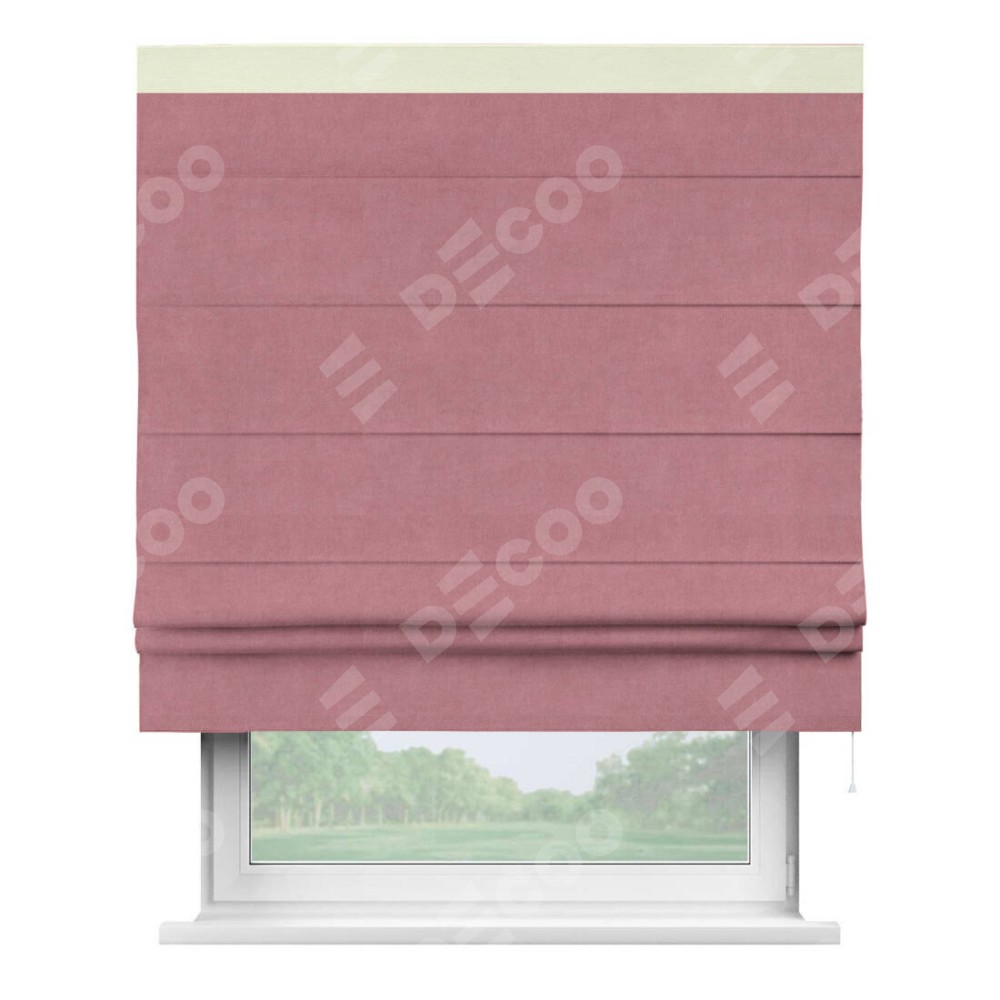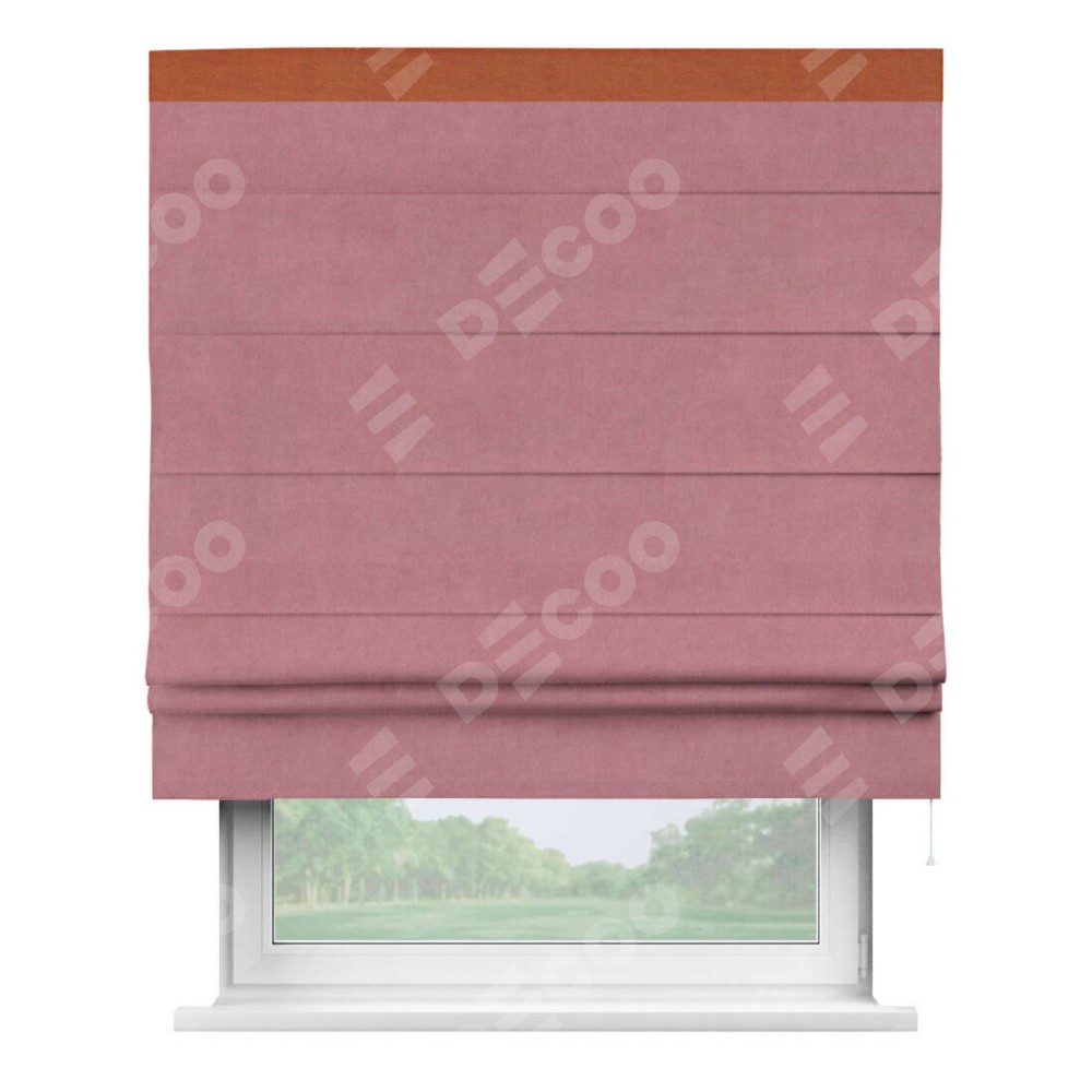 Римская штора производителя «Cortin», используется для проёма, пошита из ткани вельвет брусника, артикул ткани 85550. Отделка шторы кантом «Кинг», ткань для канта используется из вельвета разной расцветки на выбор. Имеет универсальный механизм и подходит для монтажа: на потолок, на стену и в нишу.