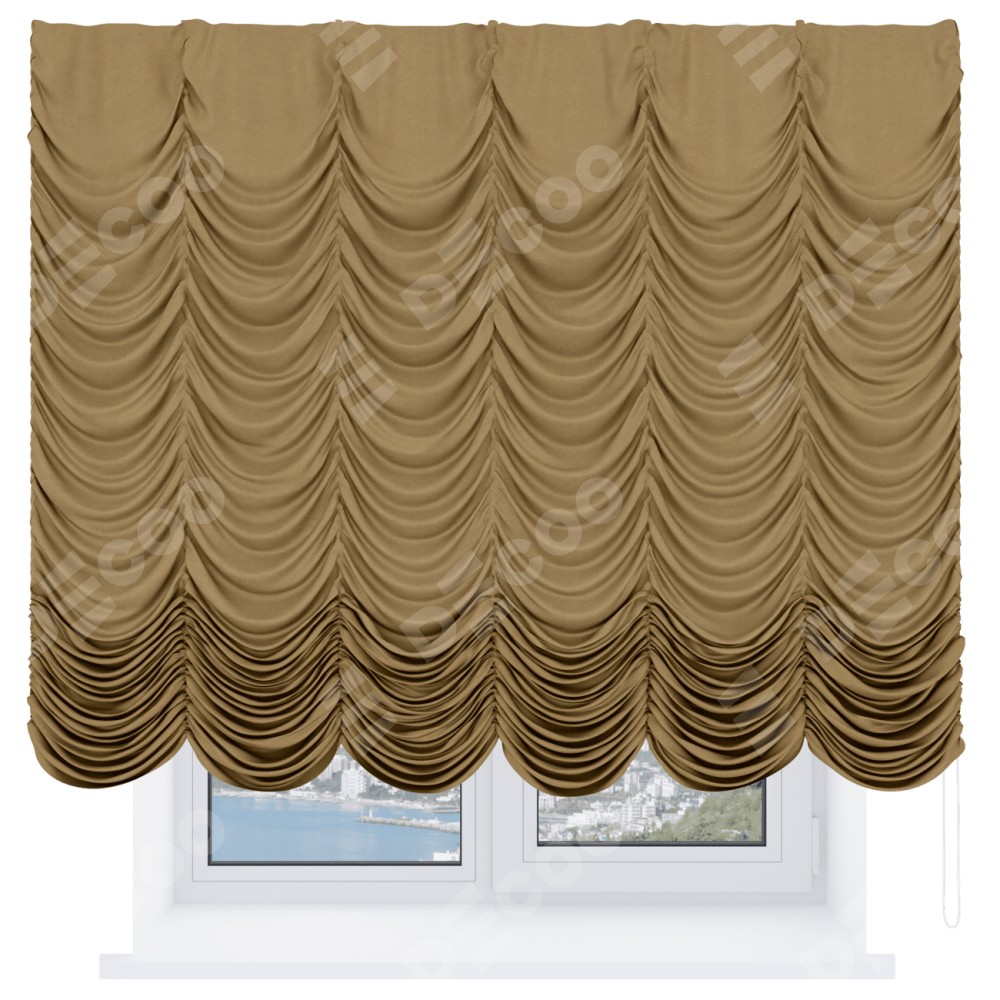 Французская штора производителя «Cortin», используется для проёма, пошита из ткани вельвет горчица, артикул ткани 17760. Имеет универсальный механизм и подходит для монтажа: на потолок и на стену.