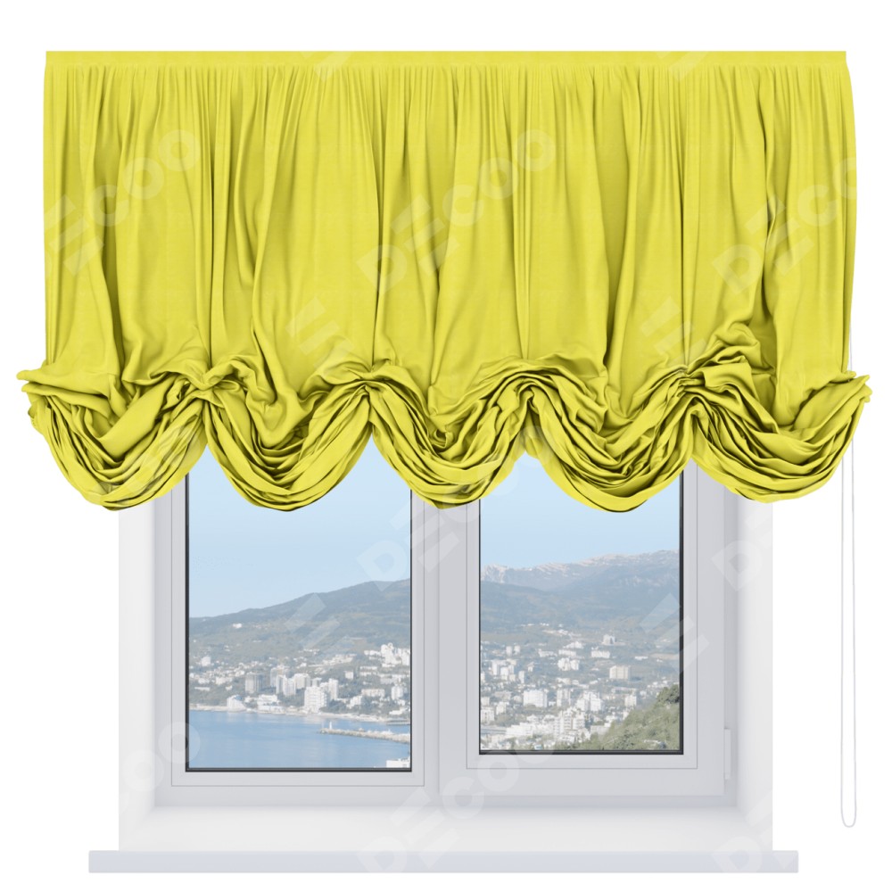 Австрийская штора производителя «Cortin», используется для проёма, пошита из ткани вельвет светло-желтый, артикул ткани 30997. Имеет универсальный механизм и подходит для монтажа: на потолок и на стену.