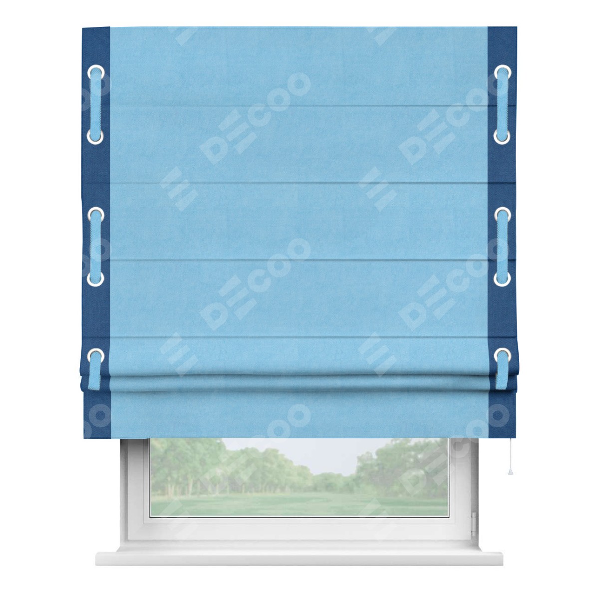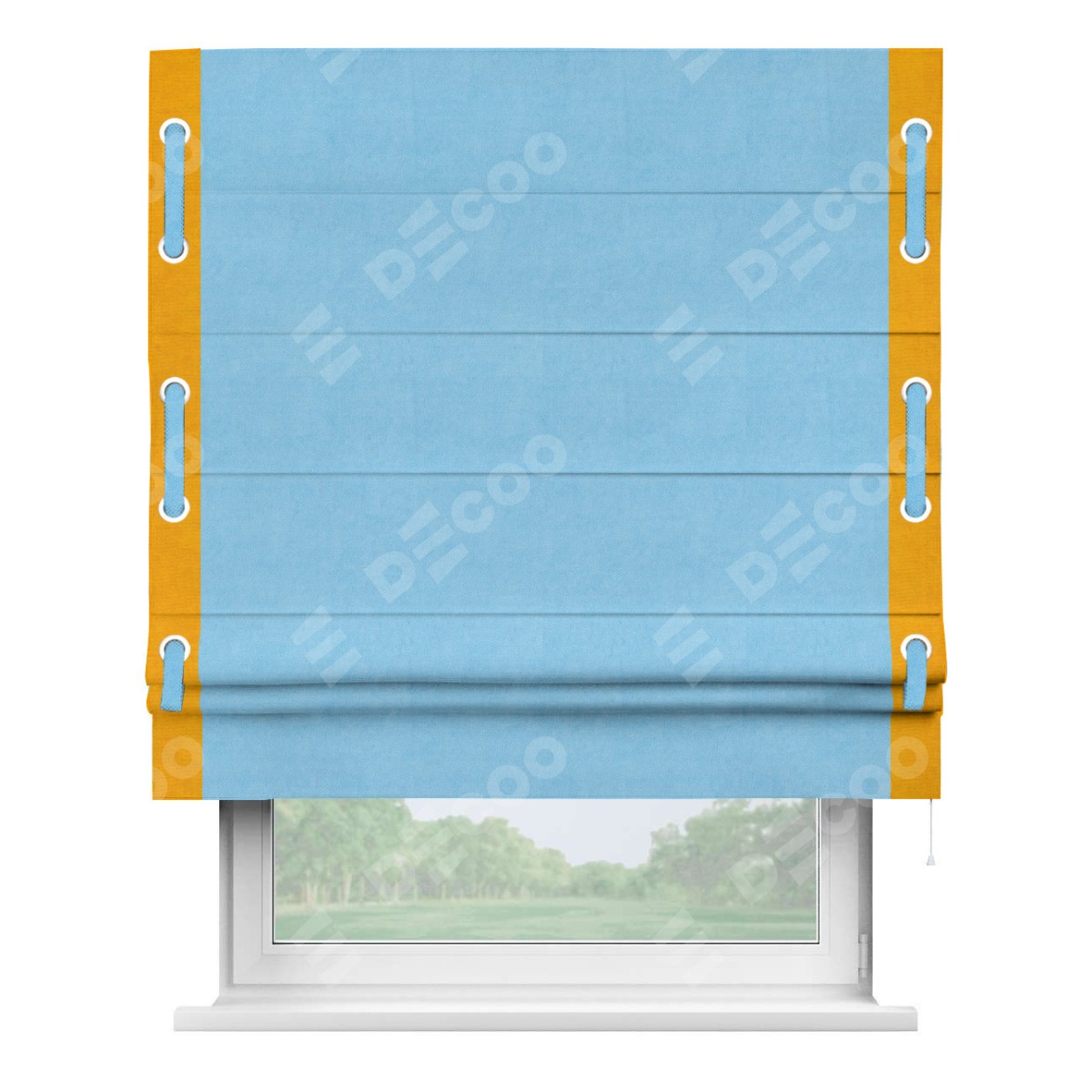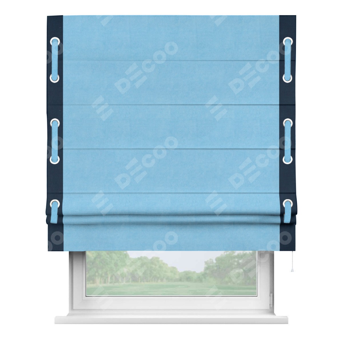 Римская штора производителя «Cortin», используется для проёма, пошита из ткани вельвет голубой, артикул ткани 85544. Отделка шторы кантом «Стрим Дуо» на кантах расположены люверсы с пояском, ткань для канта используется из вельвета разной расцветки на выбор. Ткань для пояска обычно используется из основной ткани шторы, а так же можно сделать из любой расцветки по желанию. Имеет универсальный механизм и подходит для монтажа: на потолок, на стену и в нишу.