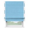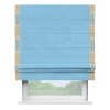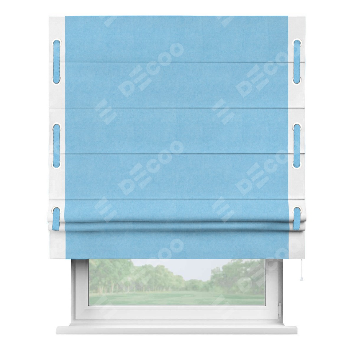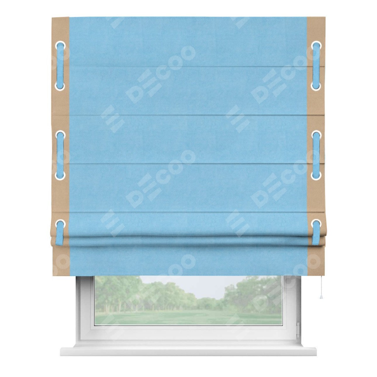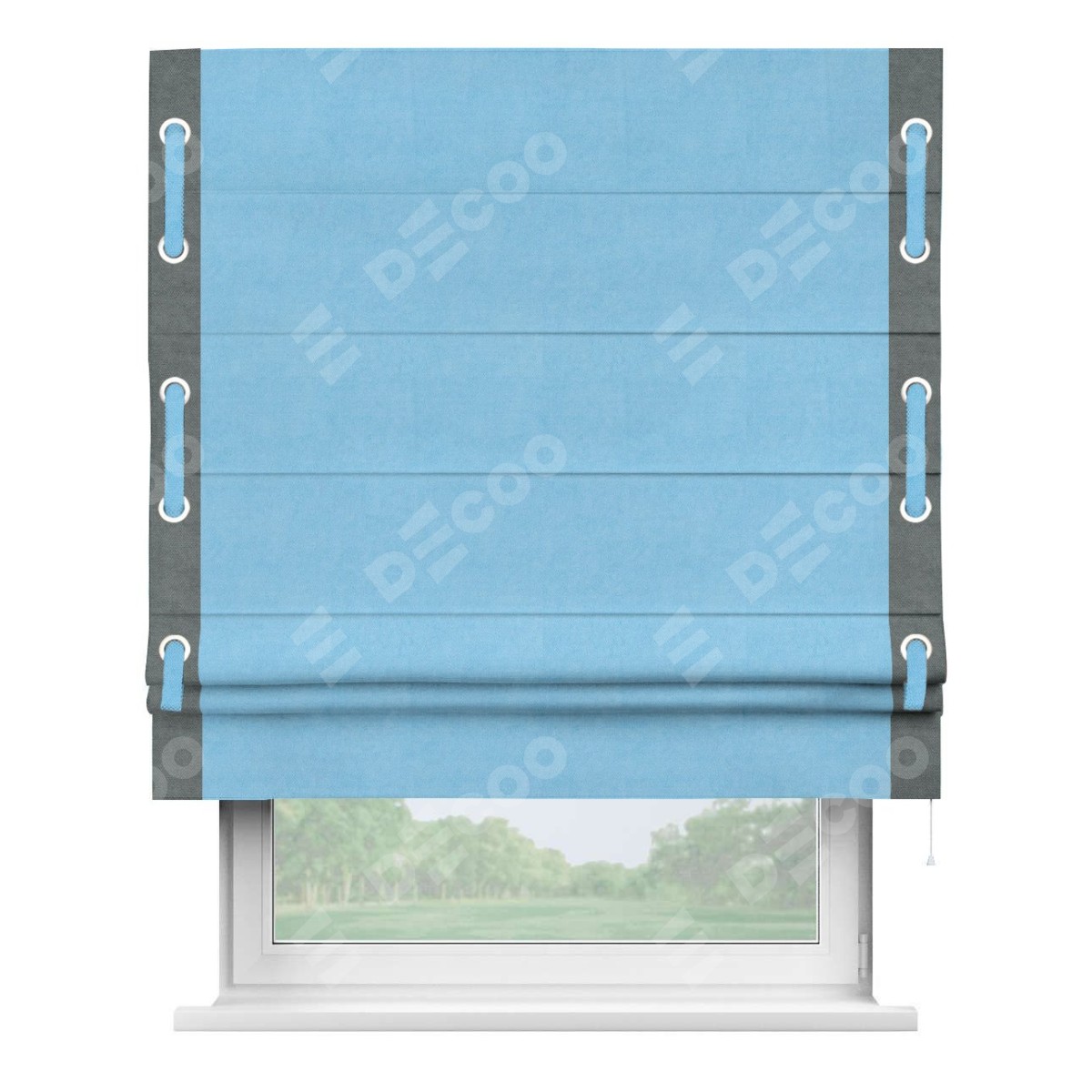Римская штора производителя «Cortin», используется для проёма, пошита из ткани вельвет голубой, артикул ткани 85544. Отделка шторы кантом «Стрим Дуо» на кантах расположены люверсы с пояском, ткань для канта используется из вельвета разной расцветки на выбор. Ткань для пояска обычно используется из основной ткани шторы, а так же можно сделать из любой расцветки по желанию. Имеет универсальный механизм и подходит для монтажа: на потолок, на стену и в нишу.