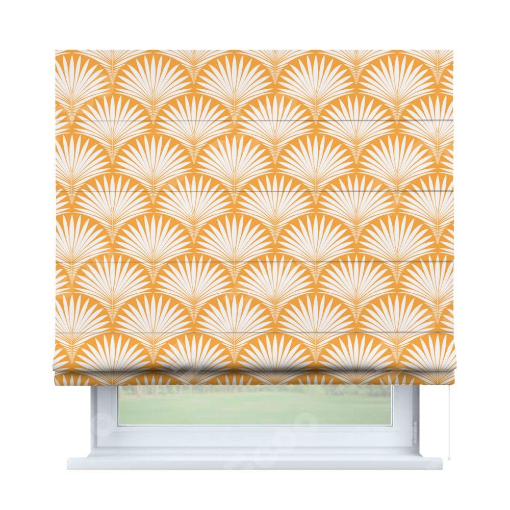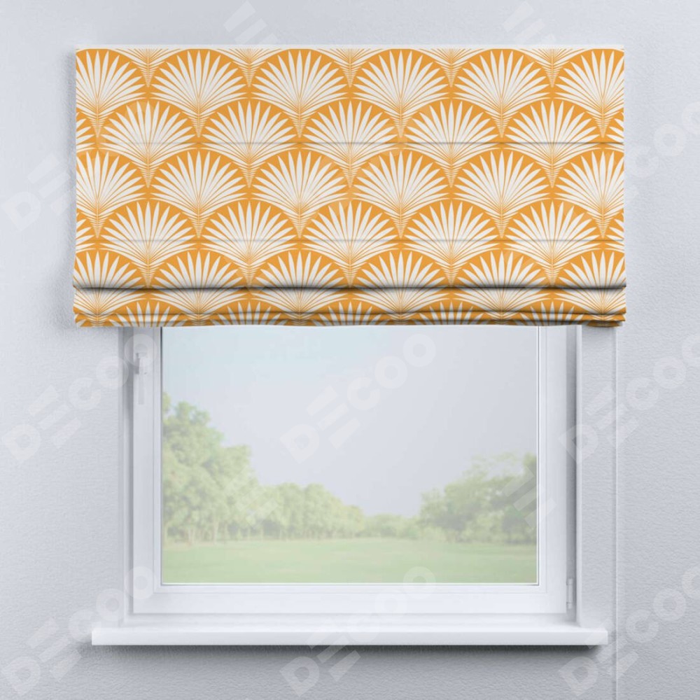 Римская штора производителя «Cortin», используется для проёма, пошита из ткани блэкаут с нанесением сублимационной печати «Арт-деко листья желтый». Имеет универсальный механизм и подходит для монтажа: на потолок, на стену и в нишу.