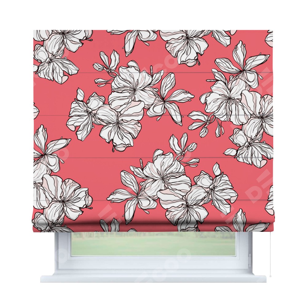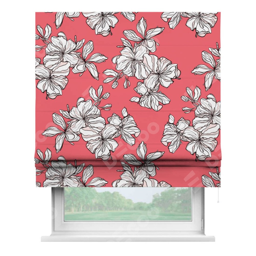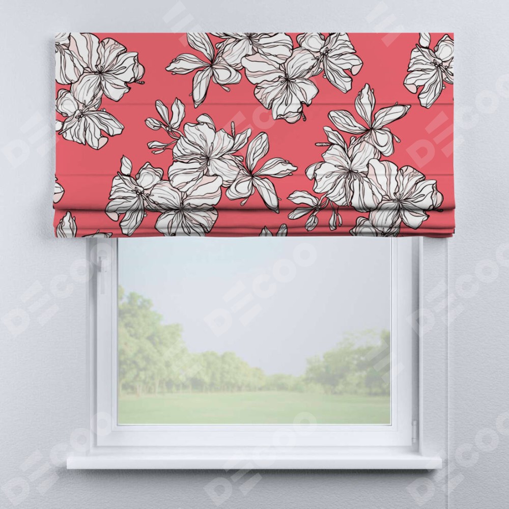 Римская штора производителя «Cortin», используется для проёма, пошита из ткани блэкаут с нанесением сублимационной печати «Белые цветы». Имеет универсальный механизм и подходит для монтажа: на потолок, на стену и в нишу.