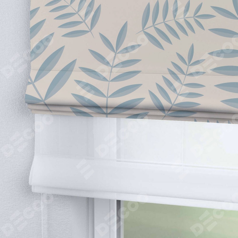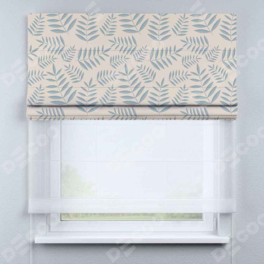 Римская штора день-ночь производителя «Cortin», используется для проёма, пошита из двух полотен, с лицевой блэкаут с нанесением сублимационной печати «Веточка с листочками», вторая ткань тюль (по стандарту комплектуется тюль белого цвета артикул V-01). Имеет универсальный механизм и подходит для монтажа: на потолок, на стену и в нишу.