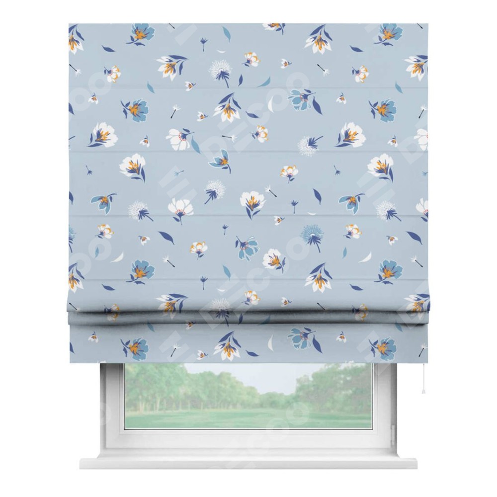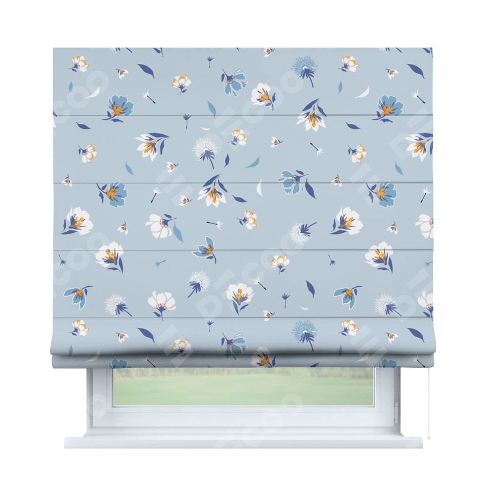 Римская штора производителя «Cortin», используется для проёма, пошита из ткани блэкаут с нанесением сублимационной печати «Голубые цветы». Имеет универсальный механизм и подходит для монтажа: на потолок, на стену и в нишу.