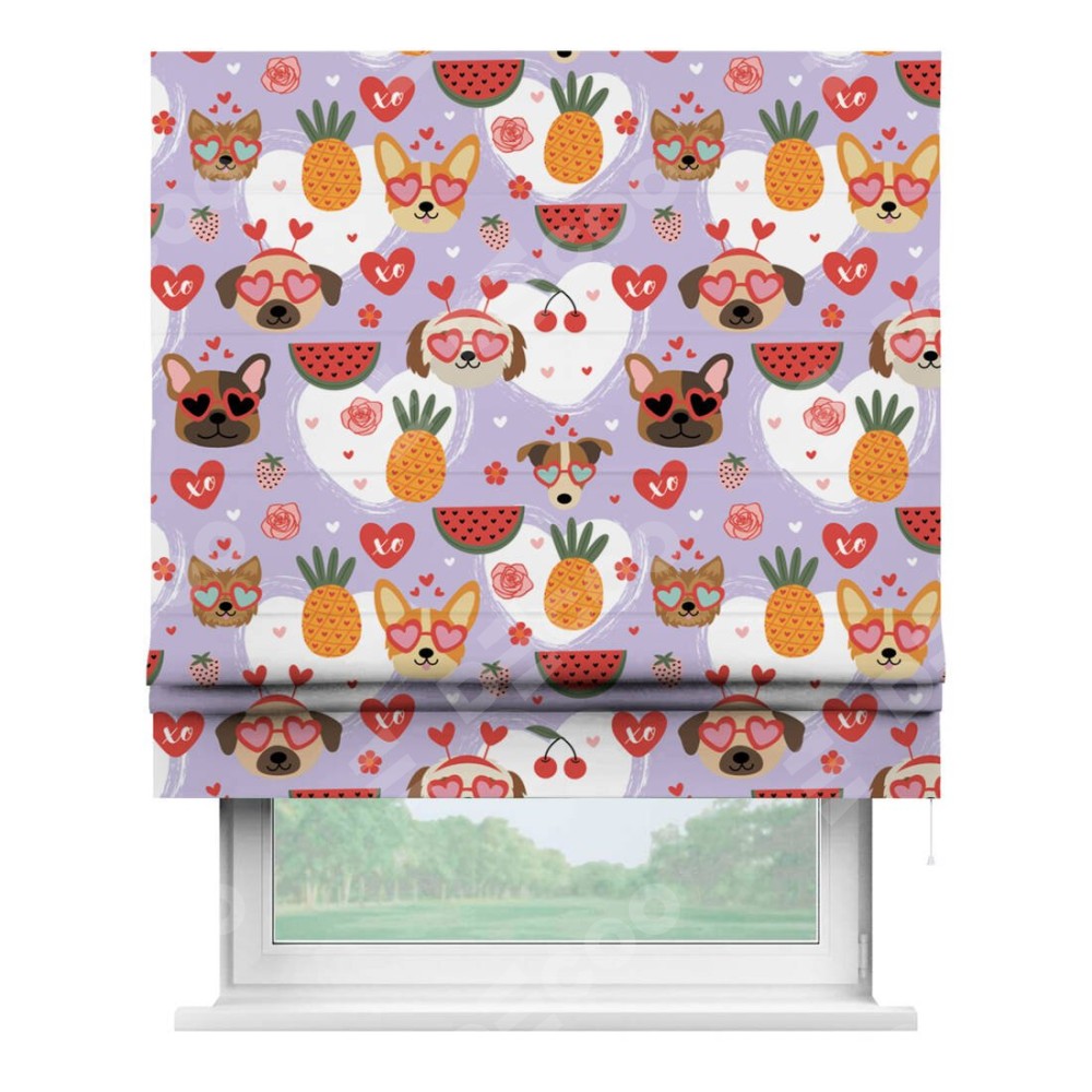 Римская штора производителя «Cortin», используется для проёма, пошита из ткани блэкаут с нанесением сублимационной печати «Забавные собачки». Имеет универсальный механизм и подходит для монтажа: на потолок, на стену и в нишу.