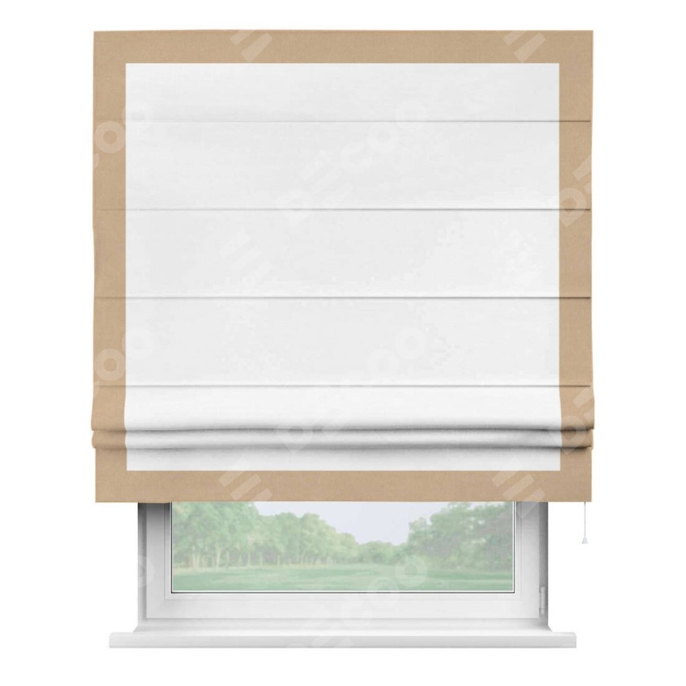 Римская штора производителя «Cortin», используется для проёма, пошита из ткани вельвет дымчато-белый, артикул ткани 85535. Отделка шторы кантом «Чесс», ткань для канта используется из вельвета разной расцветки на выбор. Имеет универсальный механизм и подходит для монтажа: на потолок, на стену и в нишу.