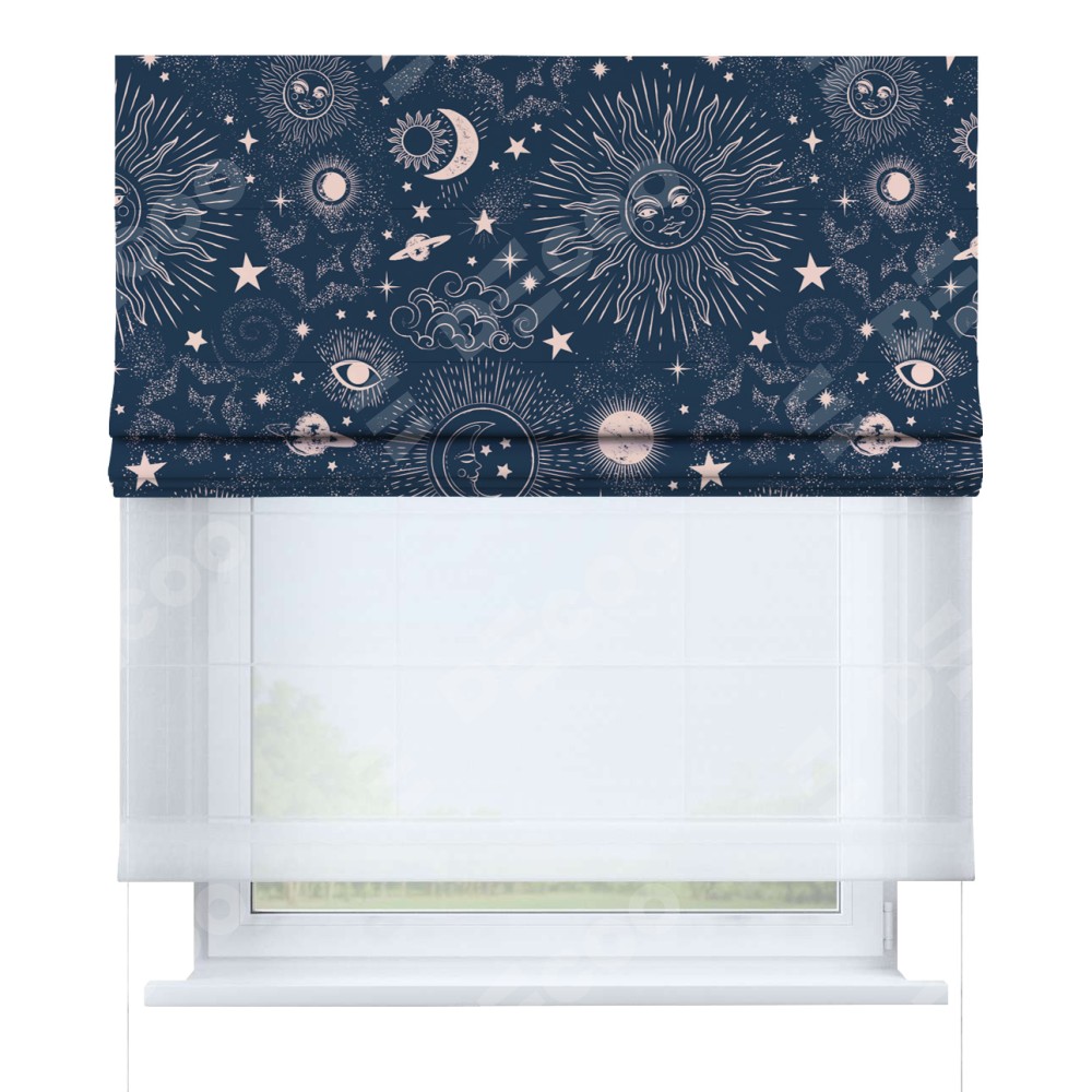 Римская штора день-ночь производителя «Cortin», используется для проёма, пошита из двух полотен, с лицевой блэкаут с нанесением сублимационной печати «Звёзды и планеты», вторая ткань тюль (по стандарту комплектуется тюль белого цвета артикул V-01). Имеет универсальный механизм и подходит для монтажа: на потолок, на стену и в нишу.