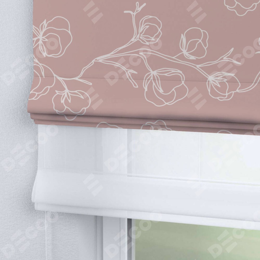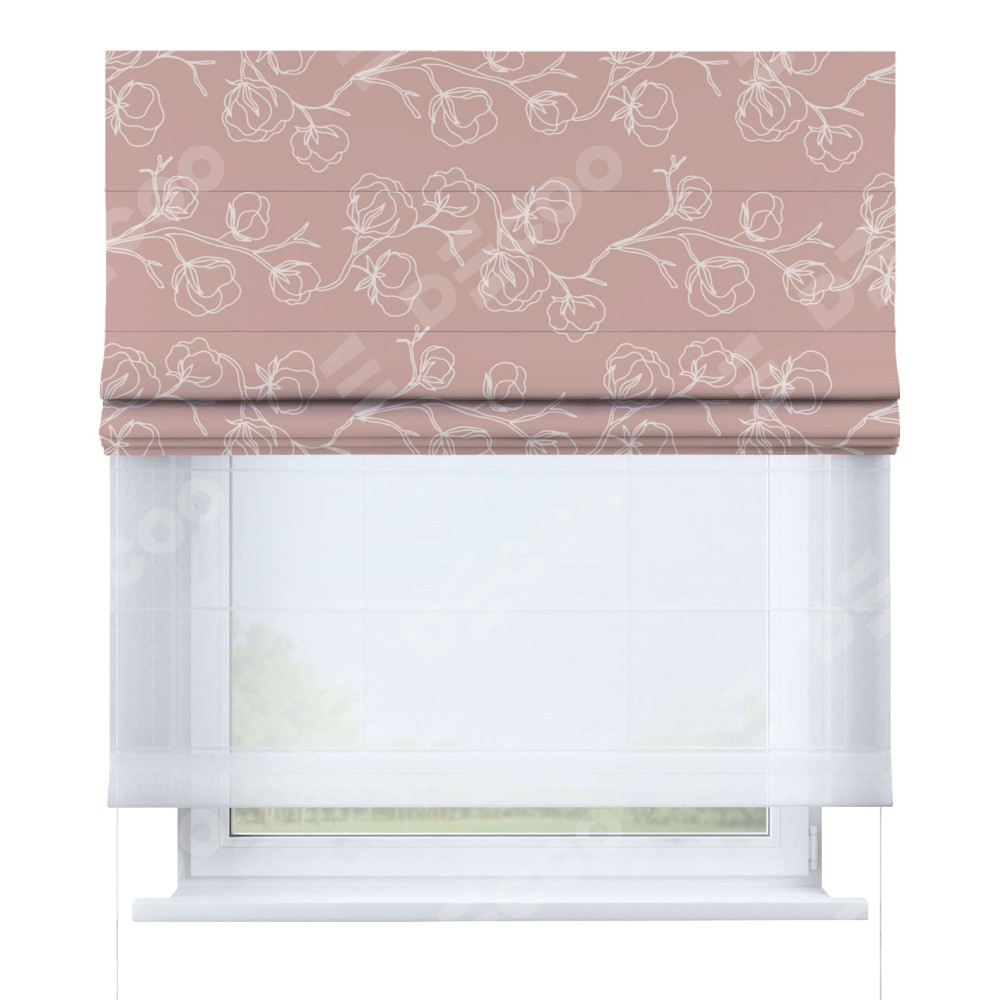 Римская штора день-ночь производителя «Cortin», используется для проёма, пошита из двух полотен, с лицевой блэкаут с нанесением сублимационной печати «Нежные цветы», вторая ткань тюль (по стандарту комплектуется тюль белого цвета артикул V-01). Имеет универсальный механизм и подходит для монтажа: на потолок, на стену и в нишу.