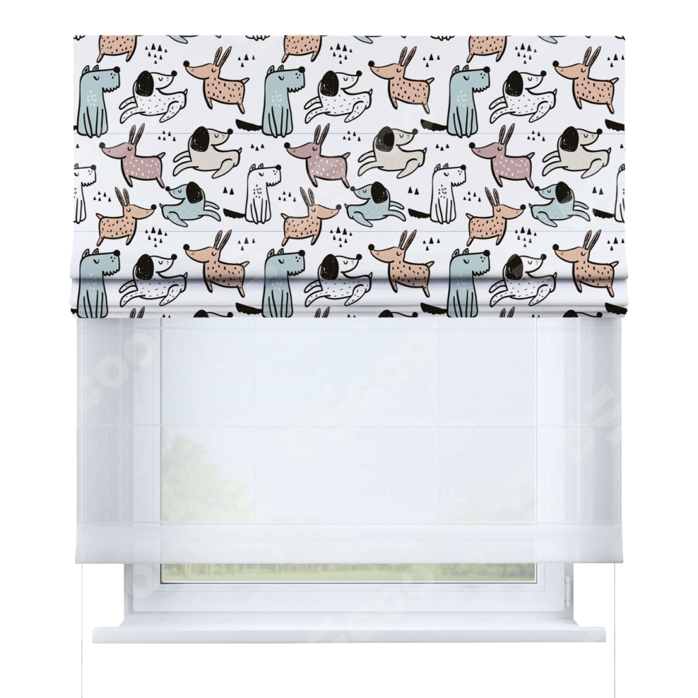 Римская штора день-ночь производителя «Cortin», используется для проёма, пошита из двух полотен, с лицевой блэкаут с нанесением сублимационной печати «Очаровательные щеночки», вторая ткань тюль (по стандарту комплектуется тюль белого цвета артикул V-01). Имеет универсальный механизм и подходит для монтажа: на потолок, на стену и в нишу.