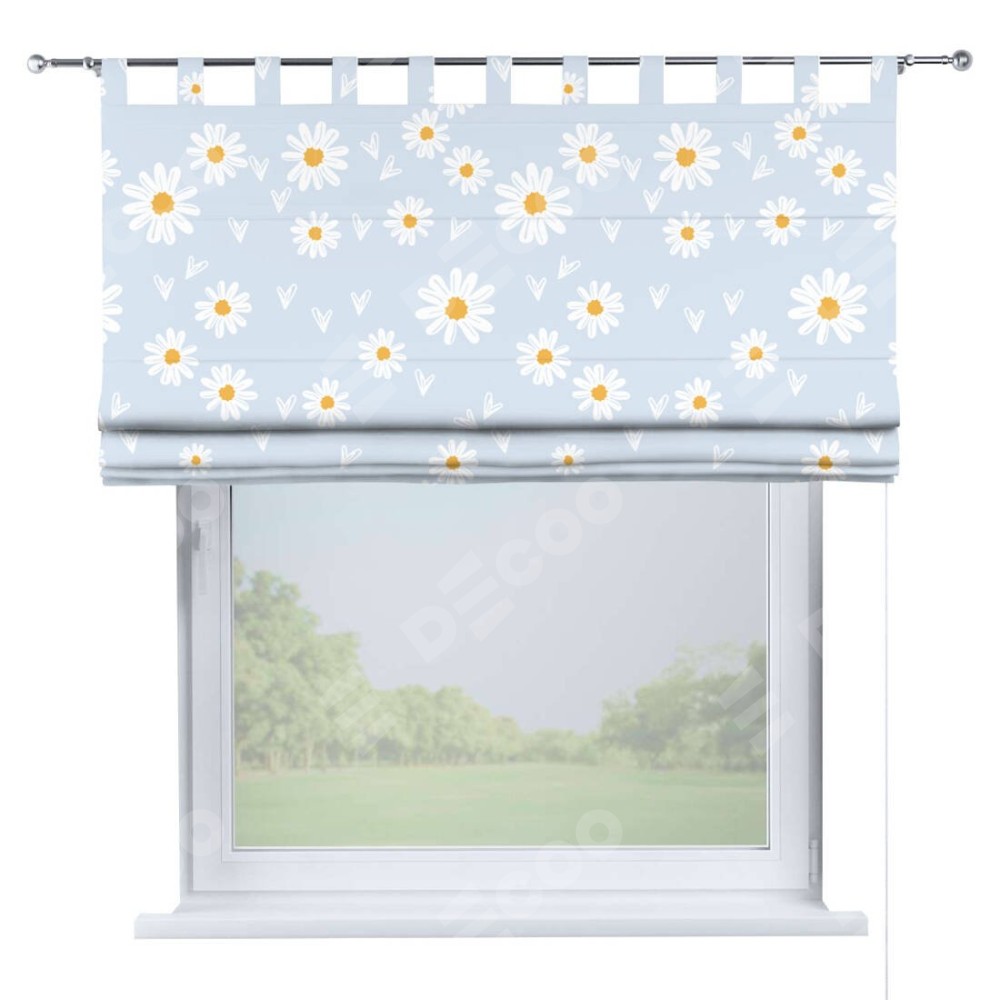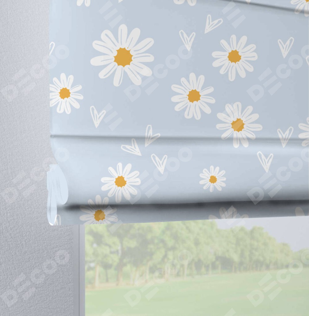 Римская штора производителя «Cortin», используется для проёма, пошита из ткани блэкаут с нанесением сублимационной печати «Летние ромашки». Данная модель пошита на петлях, комплектуется на выбор круглым карнизом и подходит для монтажа на стену. Римская штора на петлях имеет простую систему регулировки высоты, отличительным преимуществом данной модели является простой способ монтажа. Достаточно повесить ее на трубу и штора готова!