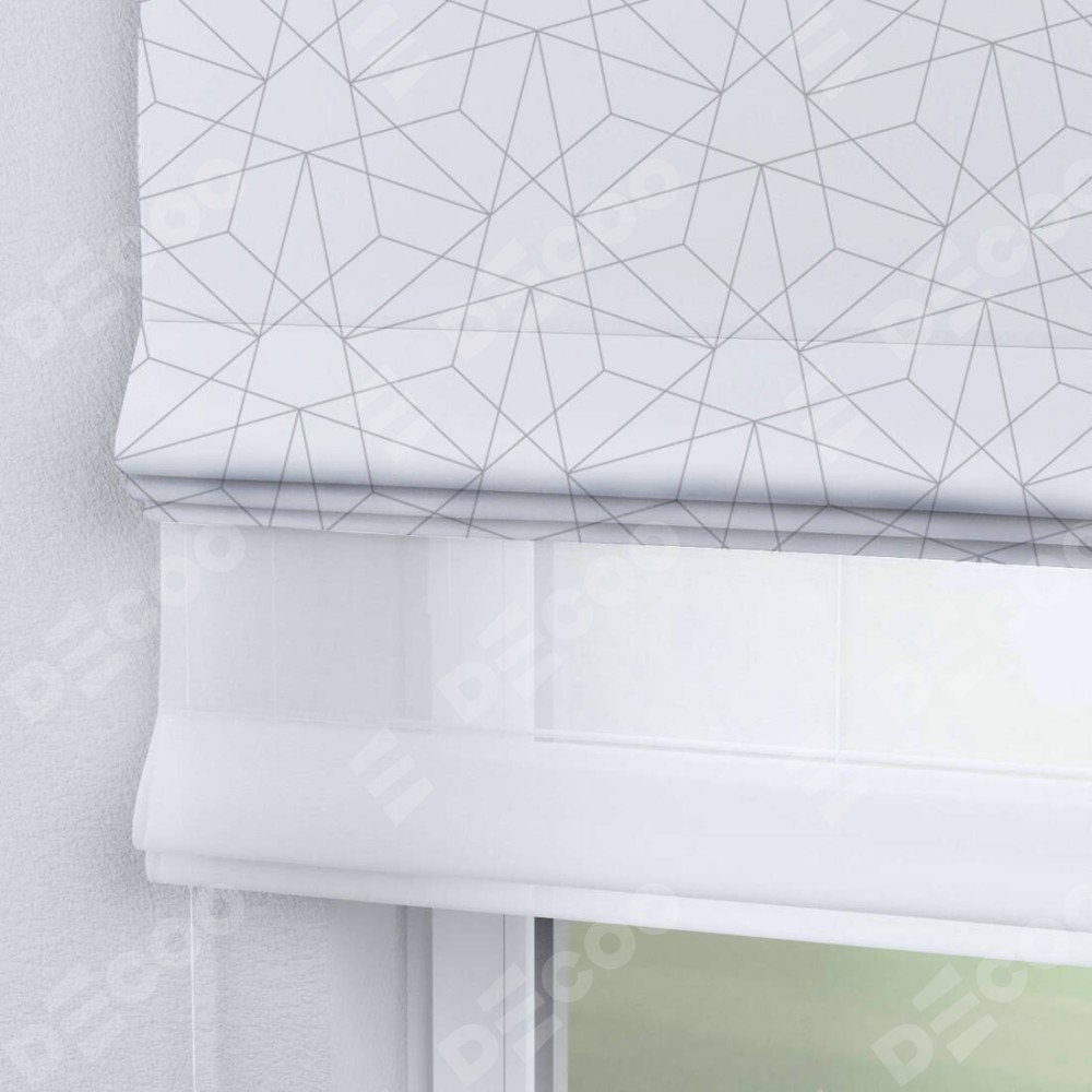 Римская штора день-ночь производителя «Cortin», используется для проёма, пошита из двух полотен, с лицевой блэкаут с нанесением сублимационной печати «Простая геометрия», вторая ткань тюль (по стандарту комплектуется тюль белого цвета артикул V-01). Имеет универсальный механизм и подходит для монтажа: на потолок, на стену и в нишу.