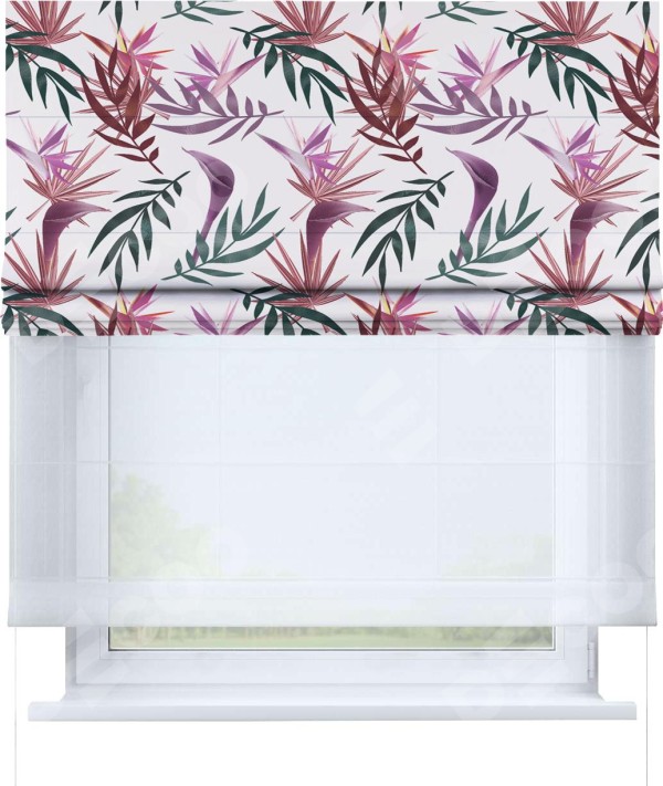 Римская штора день-ночь производителя «Cortin», используется для проёма, пошита из двух полотен, с лицевой блэкаут с нанесением сублимационной печати «Тропические побеги», вторая ткань тюль (по стандарту комплектуется тюль белого цвета артикул V-01). Имеет универсальный механизм и подходит для монтажа: на потолок, на стену и в нишу.