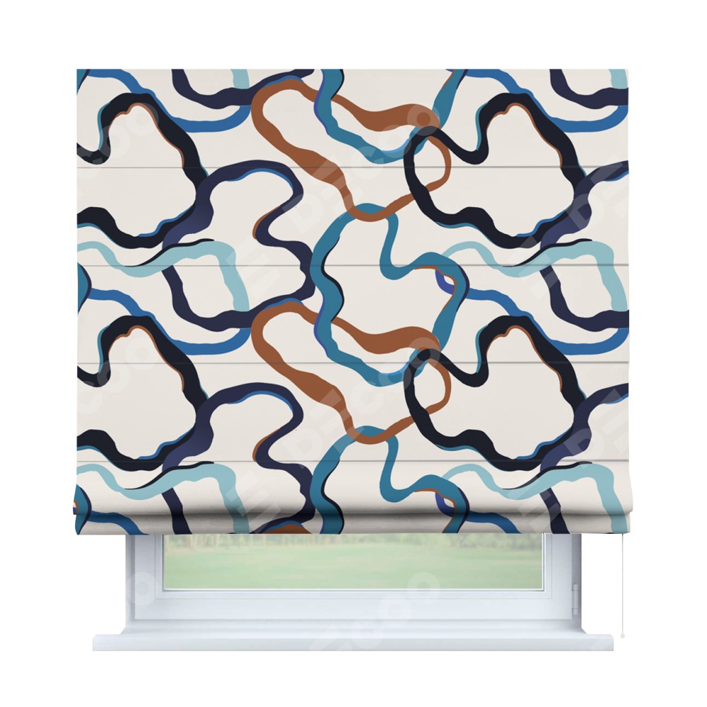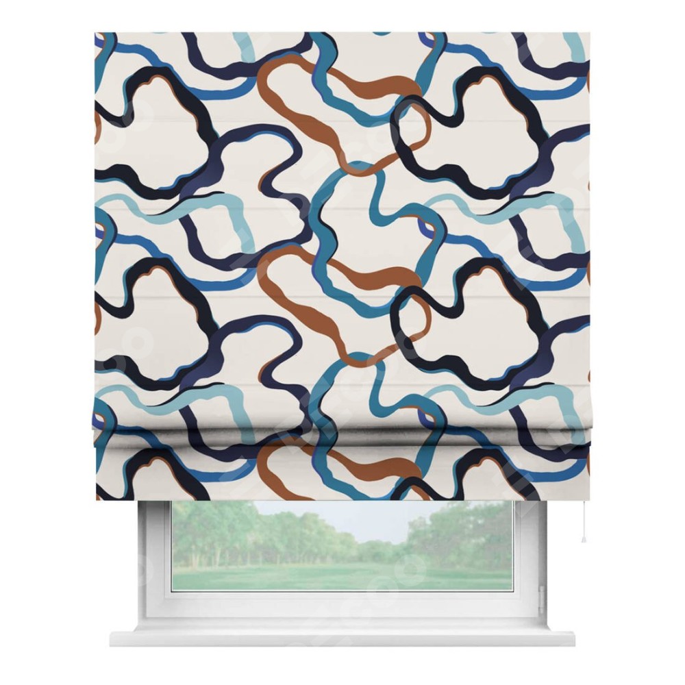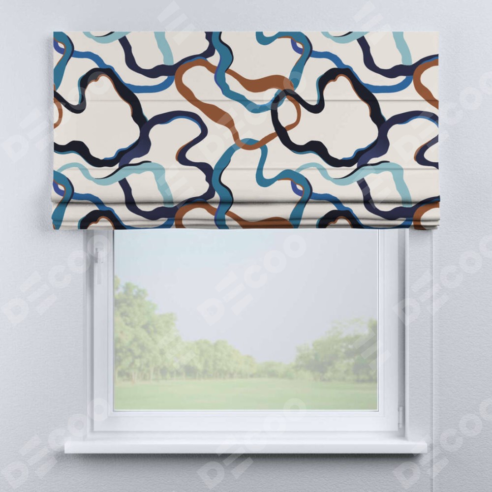 Римская штора производителя «Cortin», используется для проёма, пошита из ткани блэкаут с нанесением сублимационной печати «Волнистые ленты». Имеет универсальный механизм и подходит для монтажа: на потолок, на стену и в нишу.