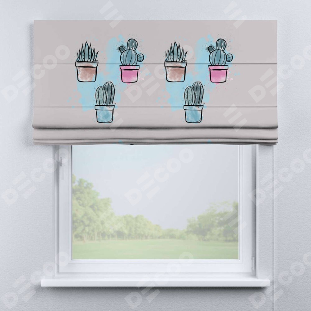 Римская штора производителя «Cortin», используется для проёма, пошита из ткани блэкаут с нанесением сублимационной печати «Кактусовая оранжерея». Имеет универсальный механизм и подходит для монтажа: на потолок, на стену и в нишу.