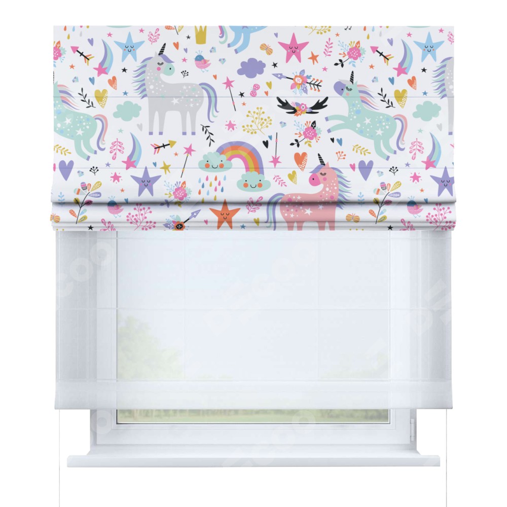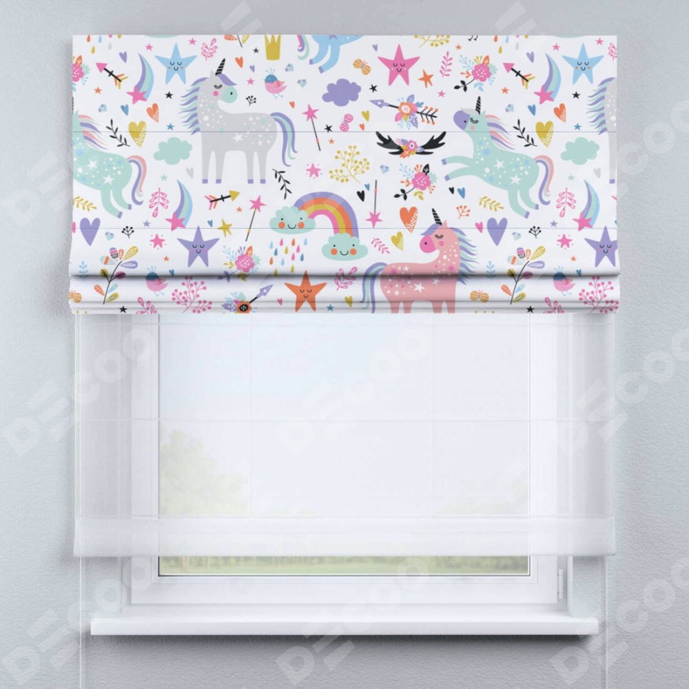 Римская штора день-ночь производителя «Cortin», используется для проёма, пошита из двух полотен, с лицевой блэкаут с нанесением сублимационной печати «Радужные единороги», вторая ткань тюль (по стандарту комплектуется тюль белого цвета артикул V-01). Имеет универсальный механизм и подходит для монтажа: на потолок, на стену и в нишу.