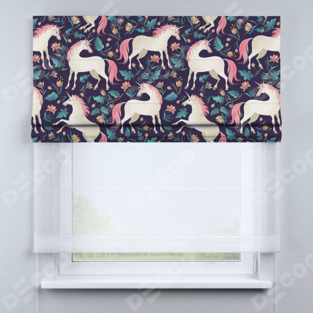 Римская штора день-ночь производителя «Cortin», используется для проёма, пошита из двух полотен, с лицевой блэкаут с нанесением сублимационной печати «Сказочные единороги», вторая ткань тюль (по стандарту комплектуется тюль белого цвета артикул V-01). Имеет универсальный механизм и подходит для монтажа: на потолок, на стену и в нишу.