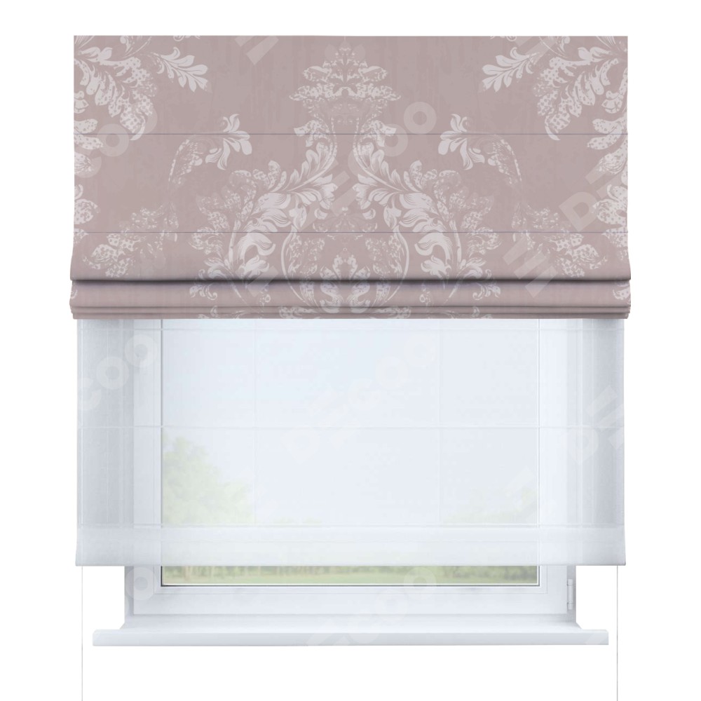 Римская штора день-ночь производителя «Cortin», используется для проёма, пошита из двух полотен, с лицевой блэкаут с нанесением сублимационной печати «Винтажный узор бежевый», вторая ткань тюль (по стандарту комплектуется тюль белого цвета артикул V-01). Имеет универсальный механизм и подходит для монтажа: на потолок, на стену и в нишу.