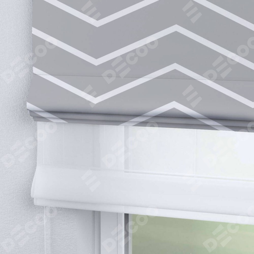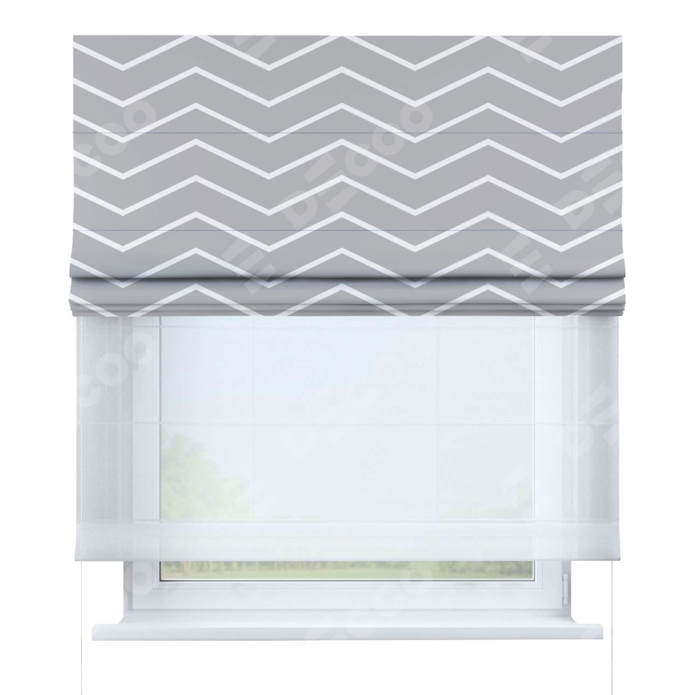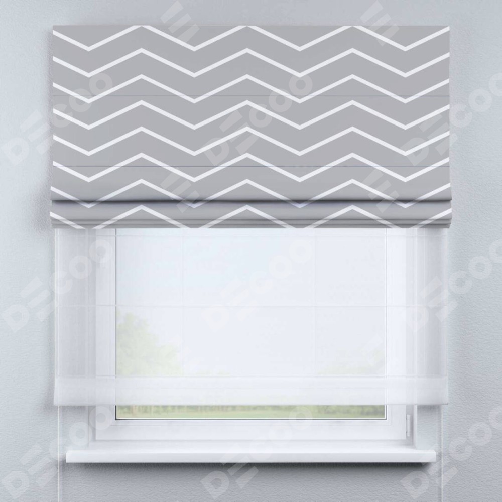 Римская штора день-ночь производителя «Cortin», используется для проёма, пошита из двух полотен, с лицевой блэкаут с нанесением сублимационной печати «Серый зигзаг», вторая ткань тюль (по стандарту комплектуется тюль белого цвета артикул V-01). Имеет универсальный механизм и подходит для монтажа: на потолок, на стену и в нишу.