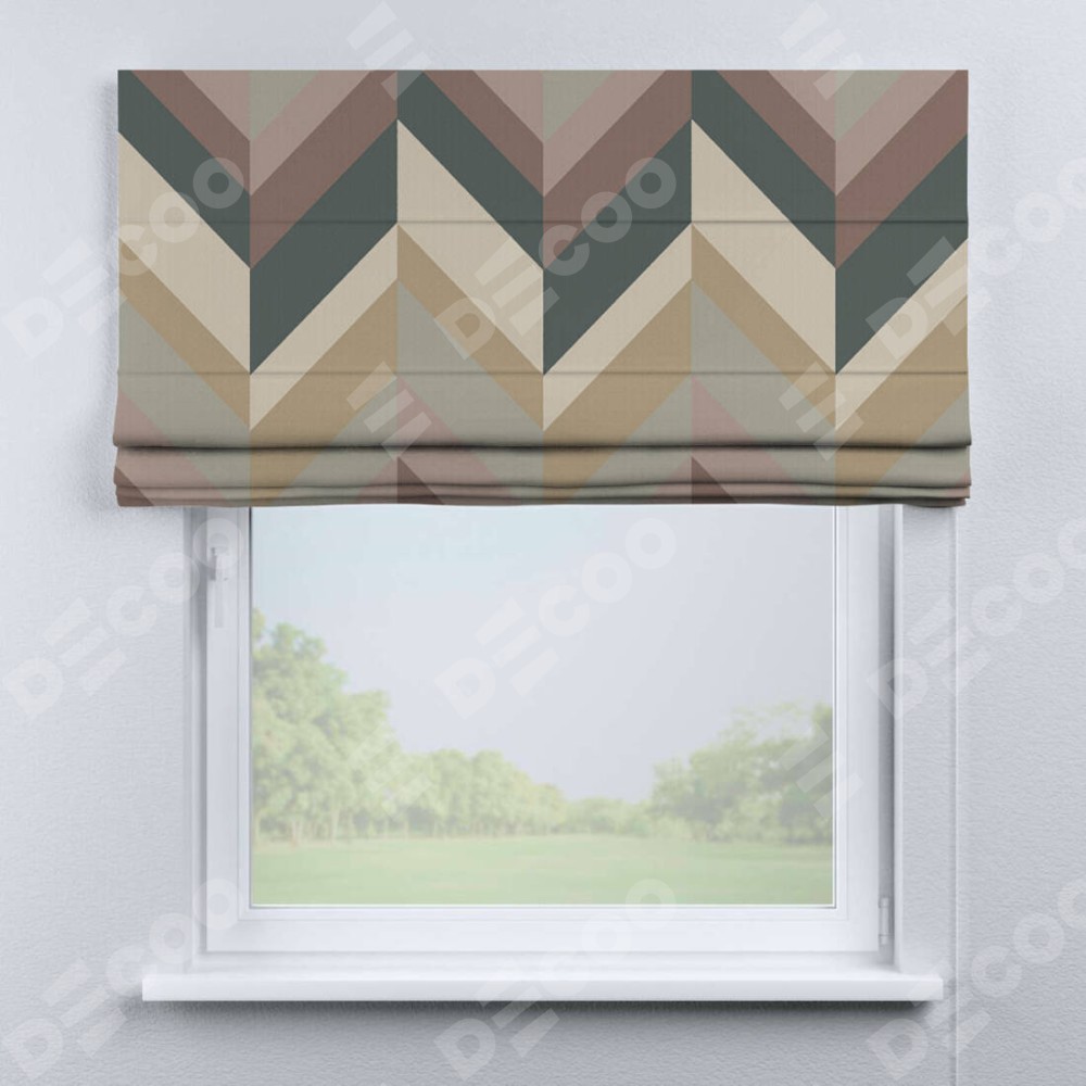 Римская штора производителя «Cortin», используется для проёма, пошита из ткани блэкаут с нанесением сублимационной печати «Шеврон Авеню». Имеет универсальный механизм и подходит для монтажа: на потолок, на стену и в нишу.