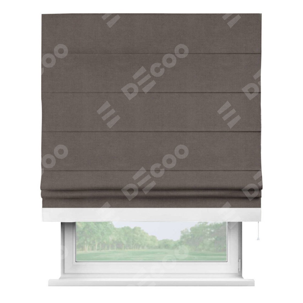 Римская штора производителя «Cortin», используется для проёма, пошита из ткани вельвет коричневый, артикул ткани 14135. Отделка шторы кантом «Джестер», ткань для канта используется из вельвета разной расцветки на выбор. Имеет универсальный механизм и подходит для монтажа: на потолок, на стену и в нишу.