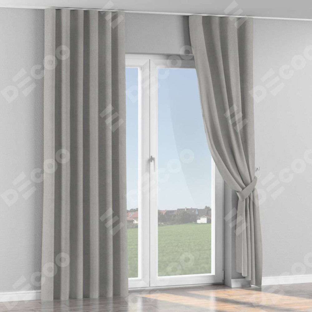Комплект прямых штор, от производителя «Cortin», пошиты из ткани блэкаут с блеском тёмно-серый, артикул ткани 34634. С изнаночной стороны в верхней части штор пристрачивается шторная лента с декоративными складками «Волна». Обратная сторона основного материала черного цвета, что обеспечивает необходимую светонепроницаемость. Для создания элегантных складок прямые шторы шьются по стандарту с коэффициентом 1:2 (на 100 см. ширины проёма 200 см. ширины ткани).