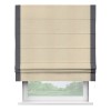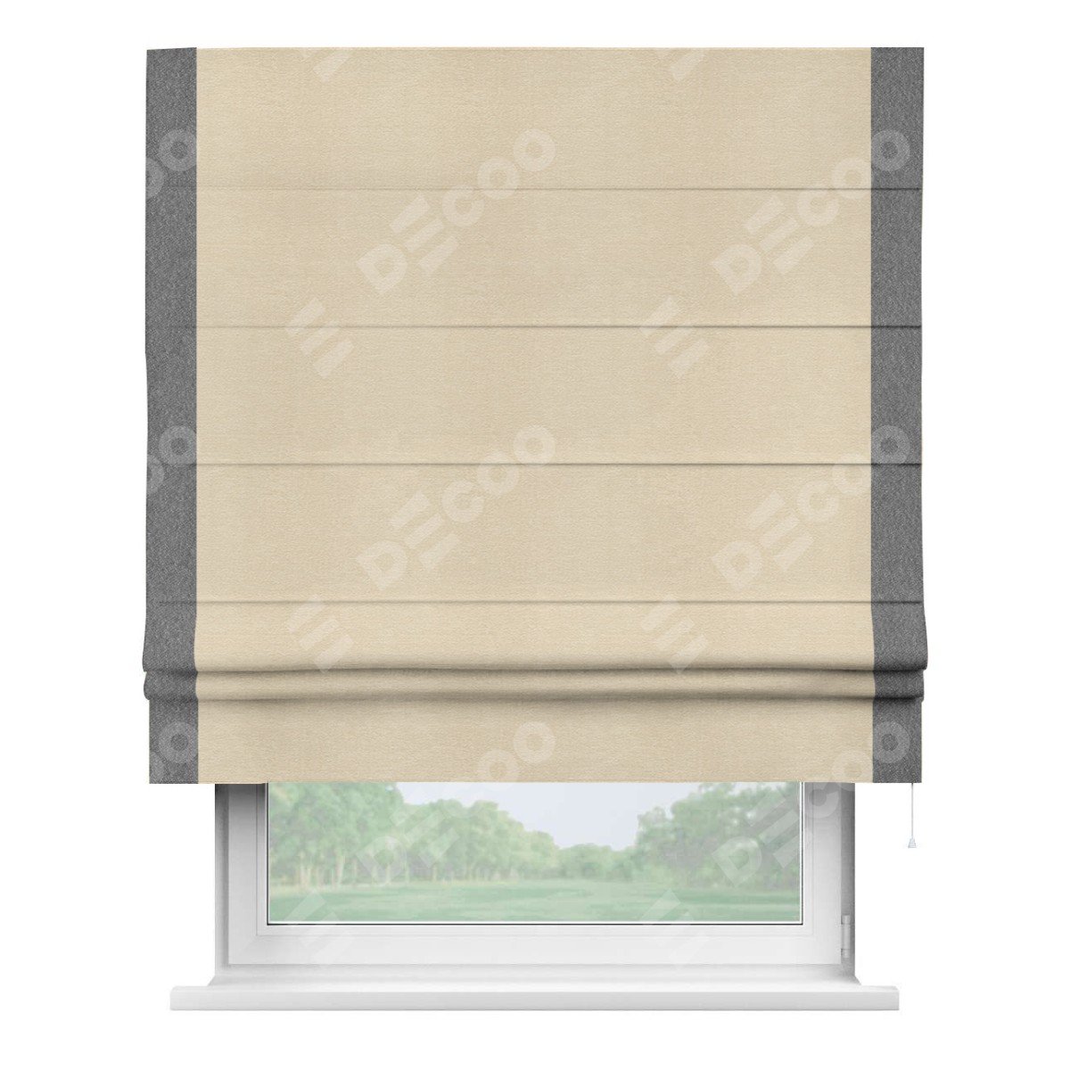 Римская штора производителя «Cortin», используется для проёма, пошита из ткани софт однотонный бежевый лайт, артикул 33100. Отделка шторы кантом «Стрим Дуо», ткань для канта используется из софта разной расцветки на выбор. Имеет универсальный механизм и подходит для монтажа: на потолок, на стену и в нишу.