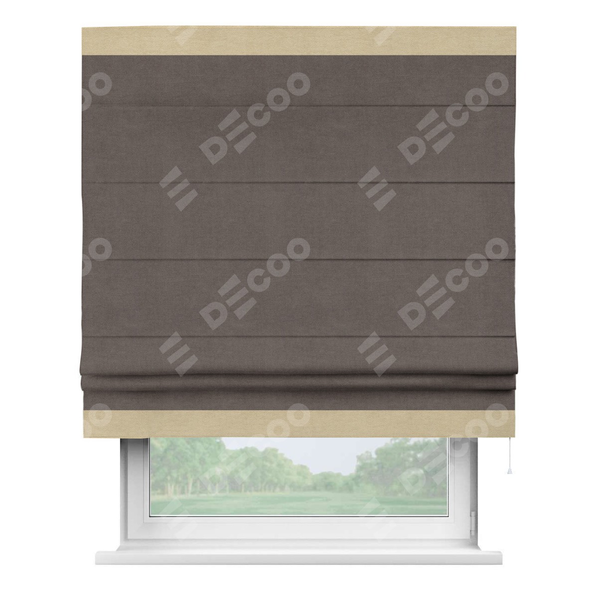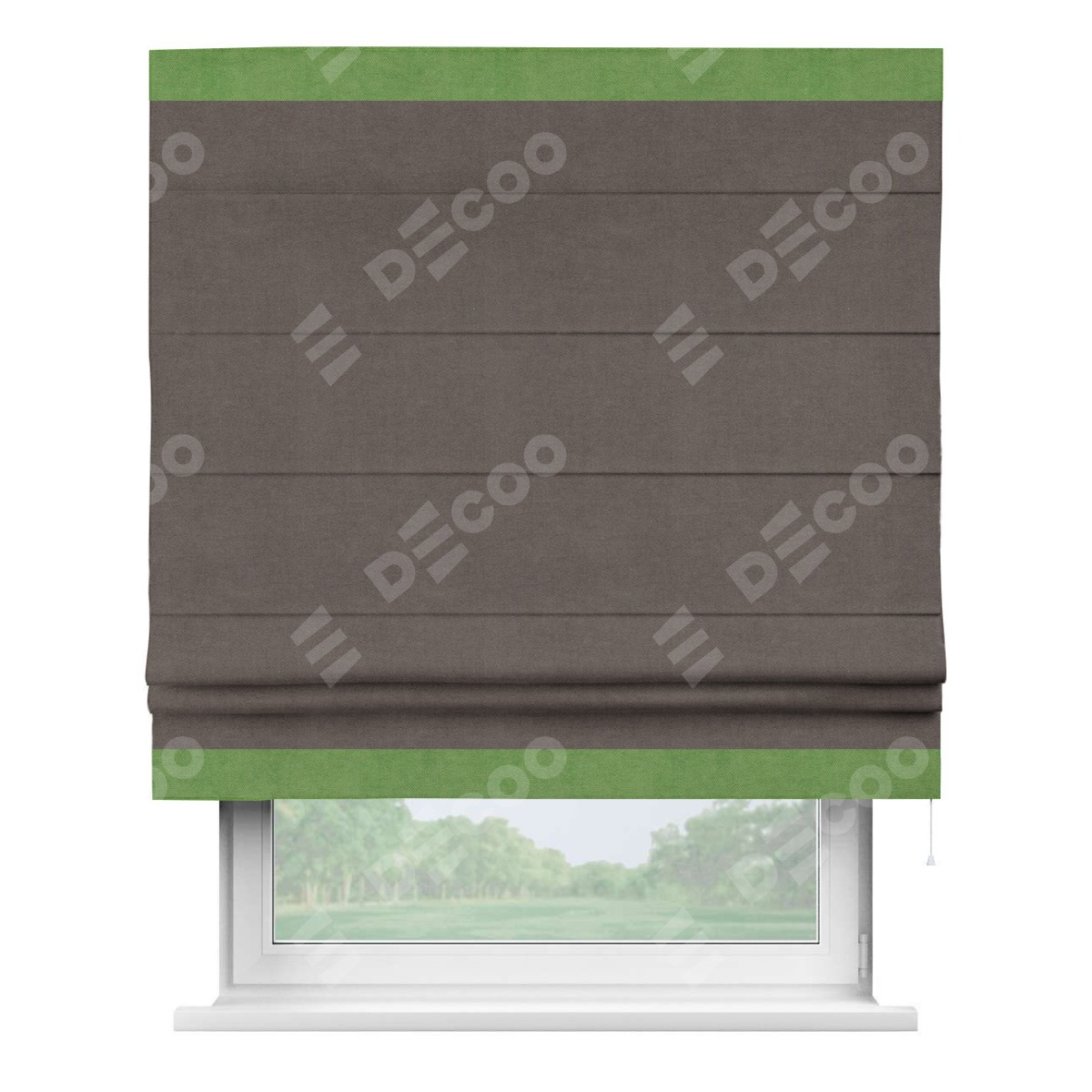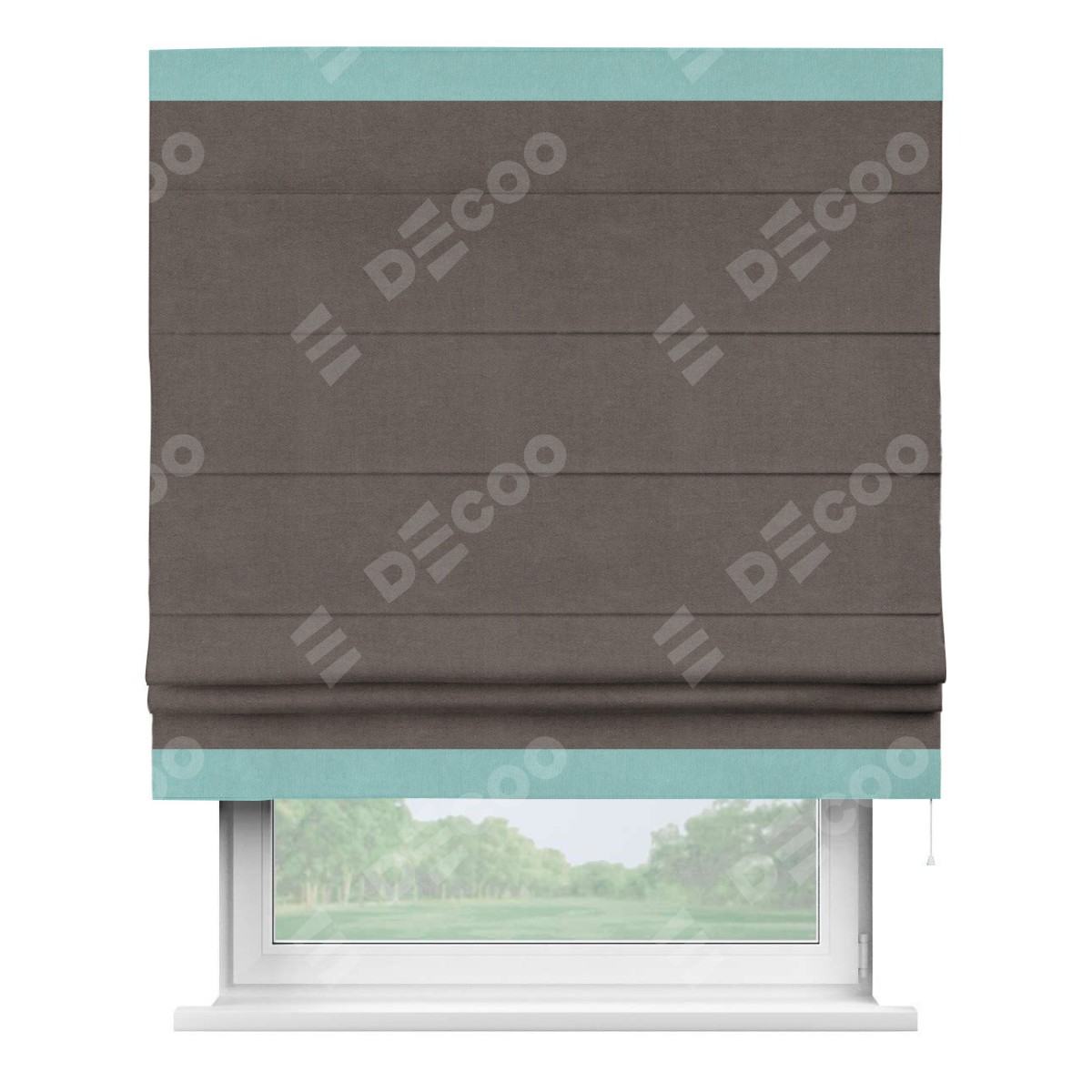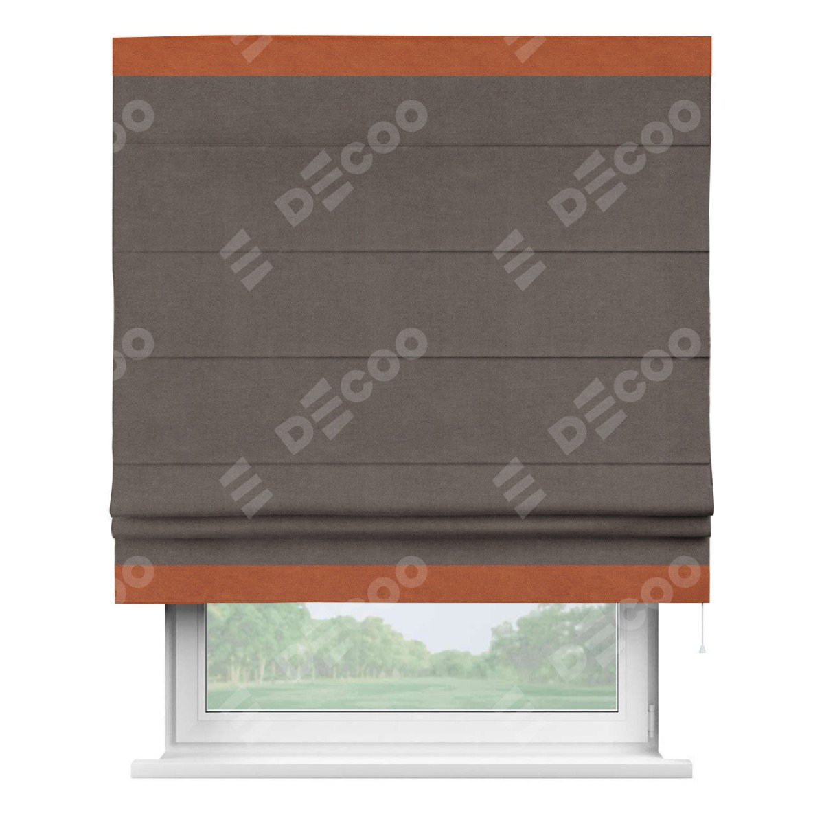 Римская штора производителя «Cortin», используется для проёма, пошита из ткани вельвет коричневый, артикул ткани 14135. Отделка шторы кантом «Горизонт», ткань для канта используется из вельвета разной расцветки на выбор. Имеет универсальный механизм и подходит для монтажа: на потолок, на стену и в нишу.