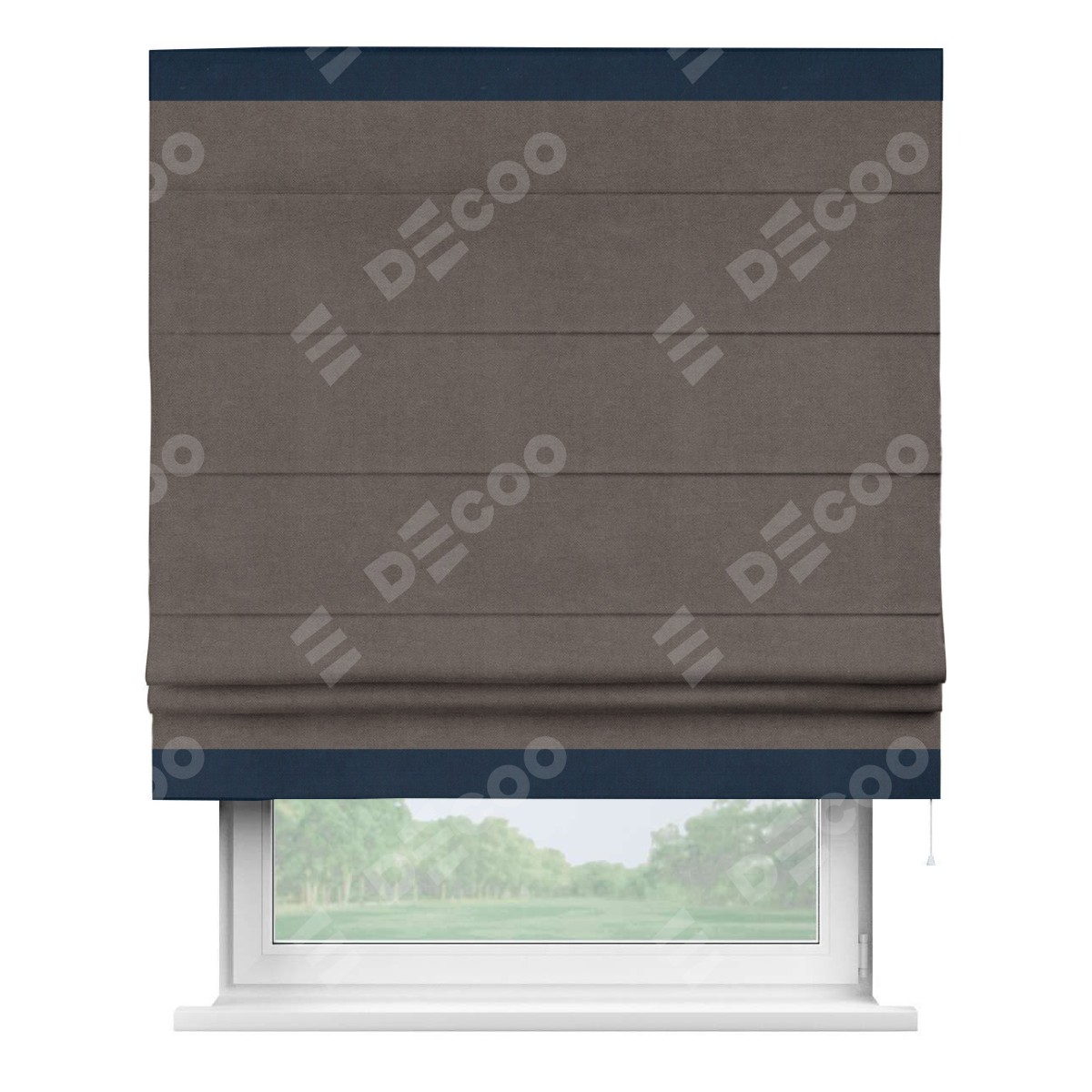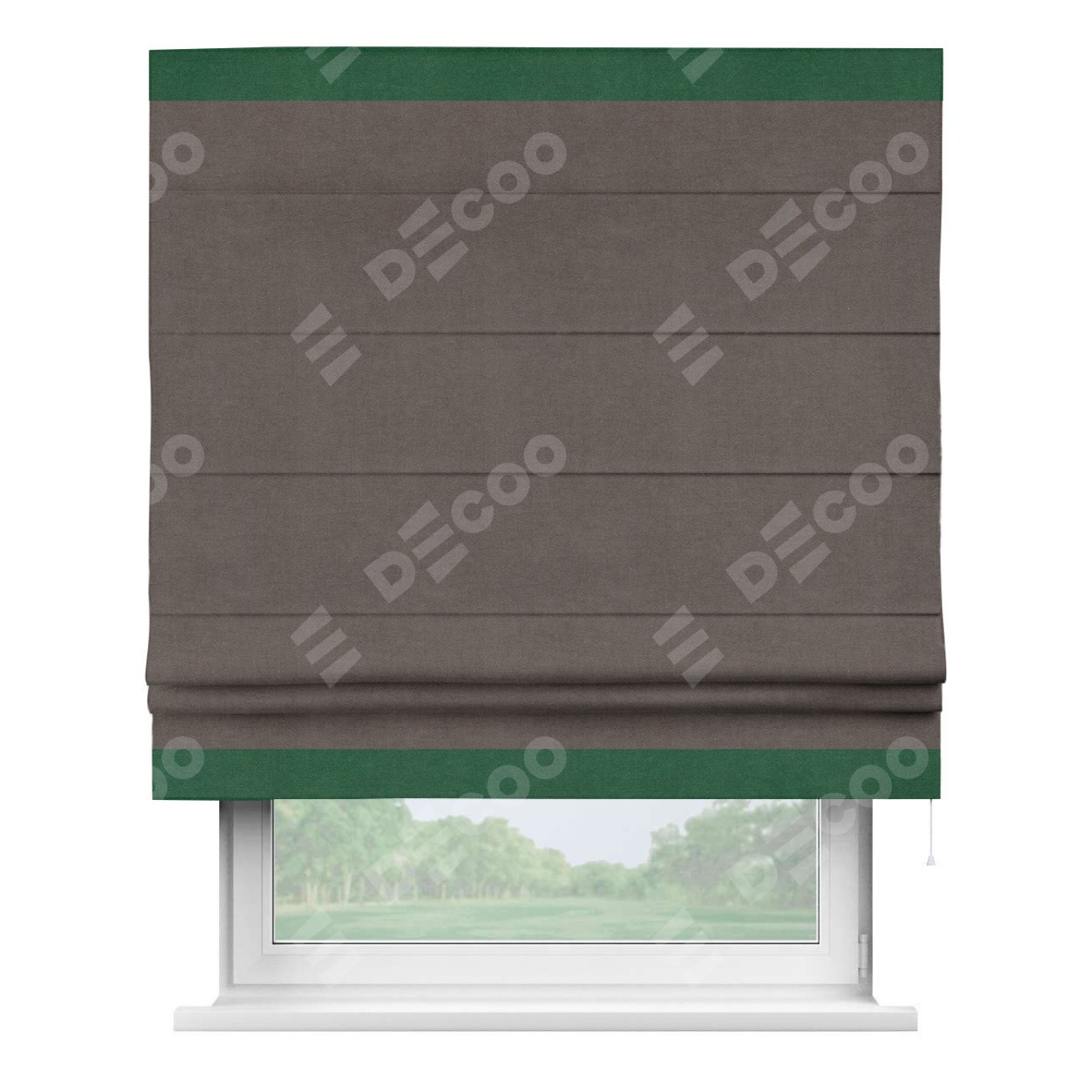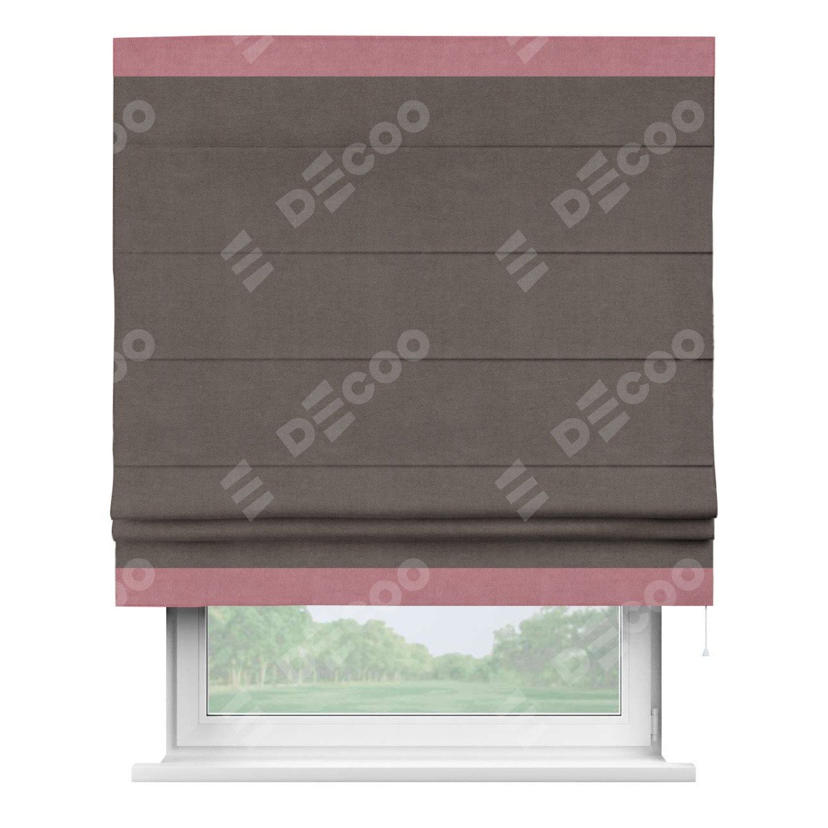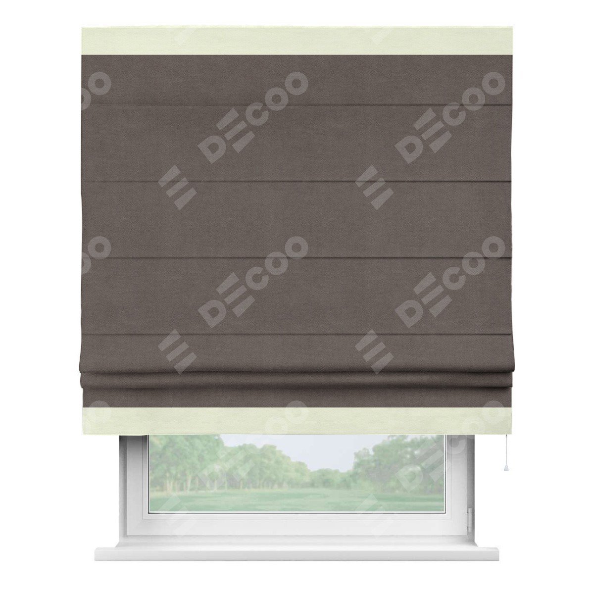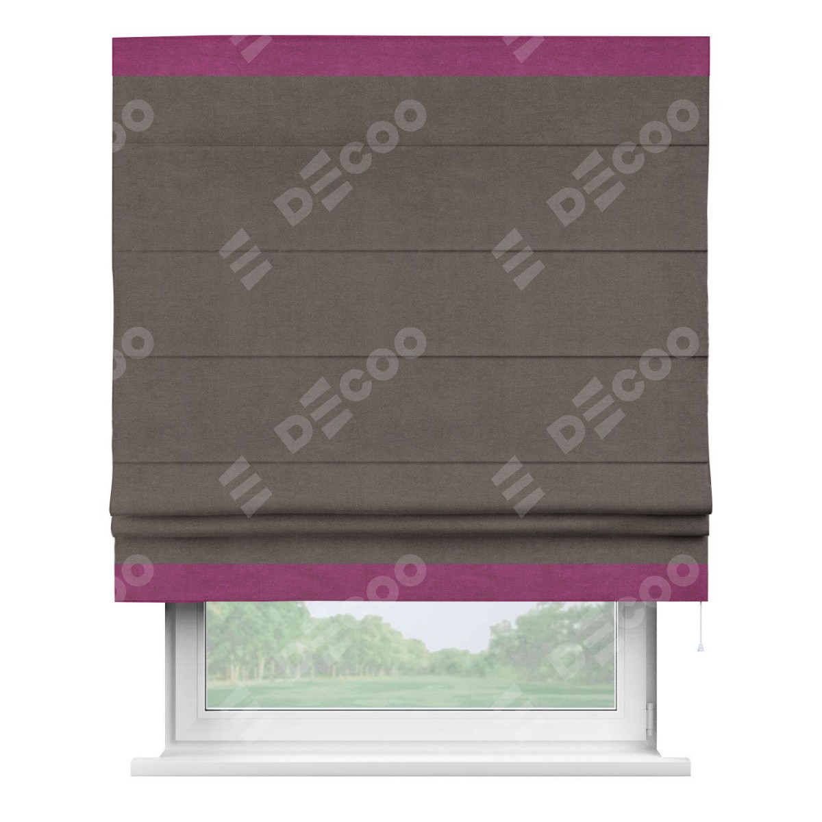 Римская штора производителя «Cortin», используется для проёма, пошита из ткани вельвет коричневый, артикул ткани 14135. Отделка шторы кантом «Горизонт», ткань для канта используется из вельвета разной расцветки на выбор. Имеет универсальный механизм и подходит для монтажа: на потолок, на стену и в нишу.