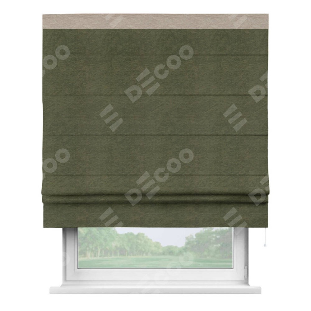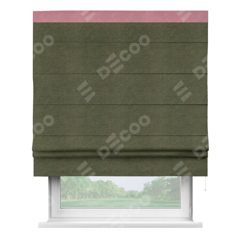 Римская штора производителя «Cortin», используется для проёма, пошита из ткани софт однотонный зелёный, артикул 33110. Отделка шторы кантом «Кинг», ткань для канта используется из софта разной расцветки на выбор. Имеет универсальный механизм и подходит для монтажа: на потолок, на стену и в нишу.