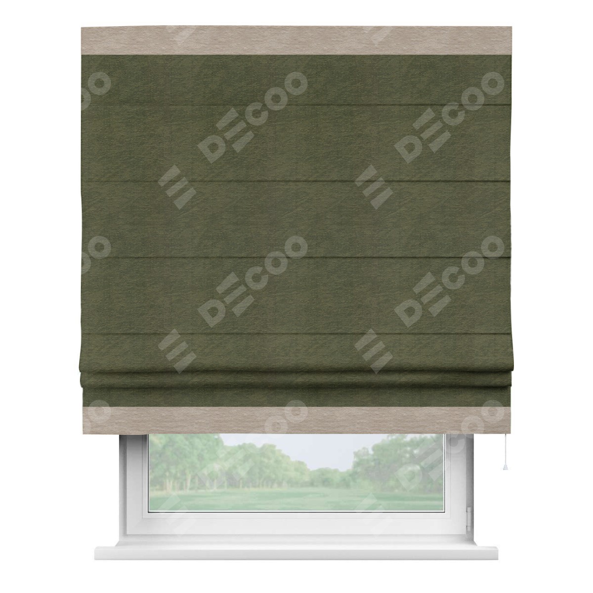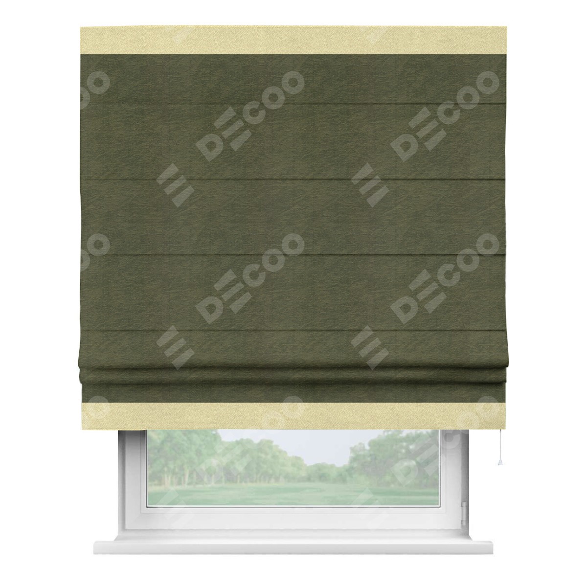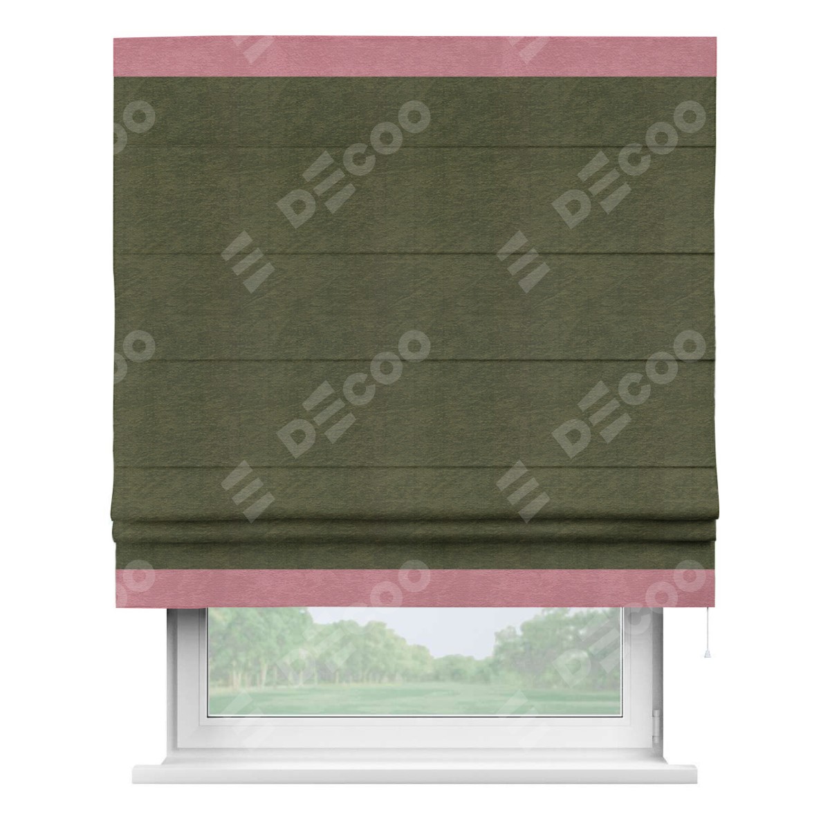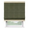 Римская штора производителя «Cortin», используется для проёма, пошита из ткани софт однотонный зелёный, артикул 33110. Отделка шторы кантом «Горизонт», ткань для канта используется из софта разной расцветки на выбор. Имеет универсальный механизм и подходит для монтажа: на потолок, на стену и в нишу.