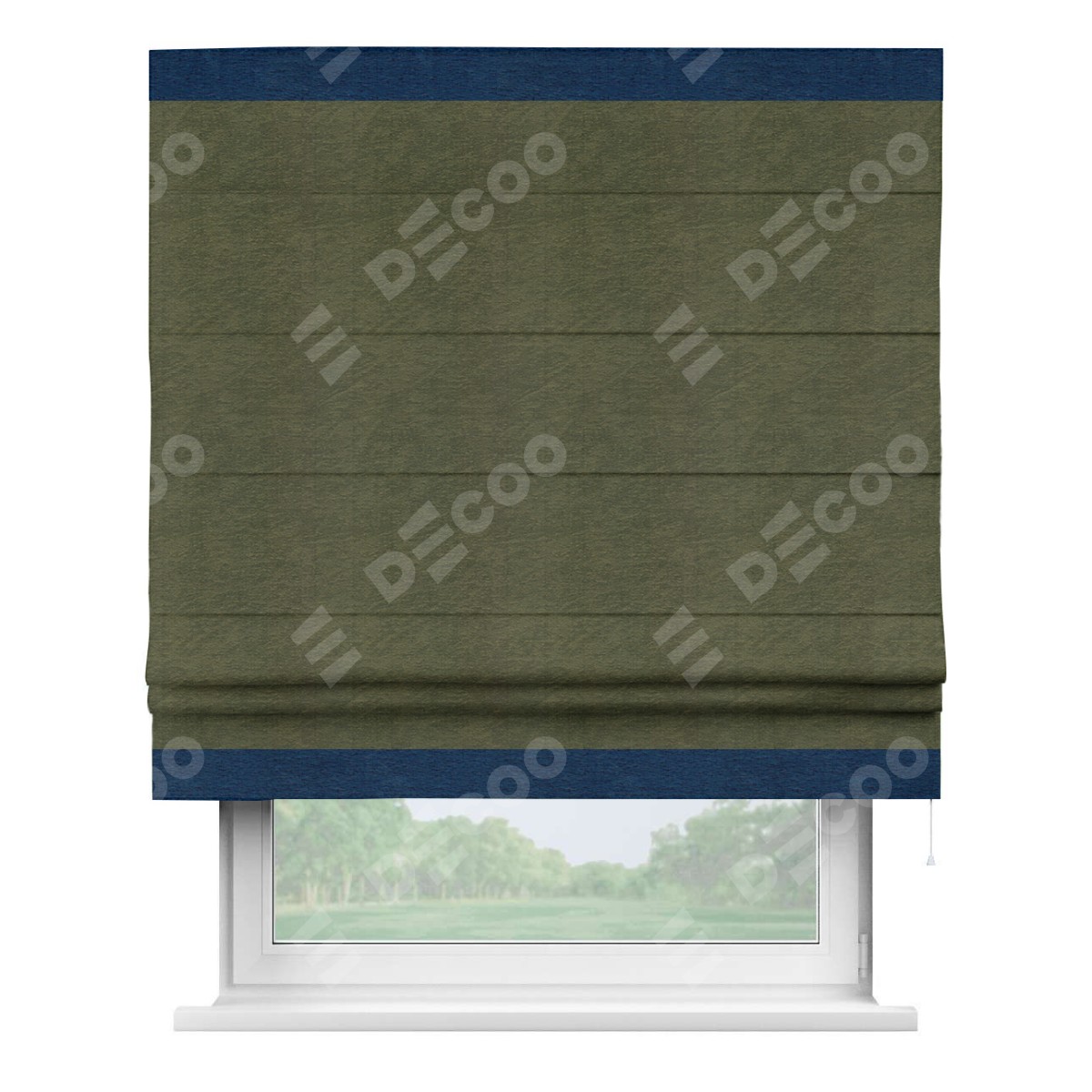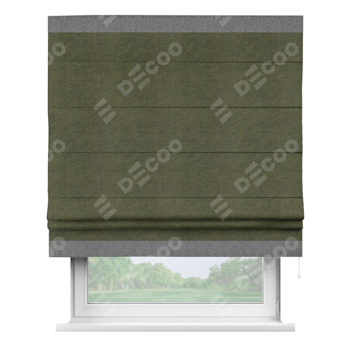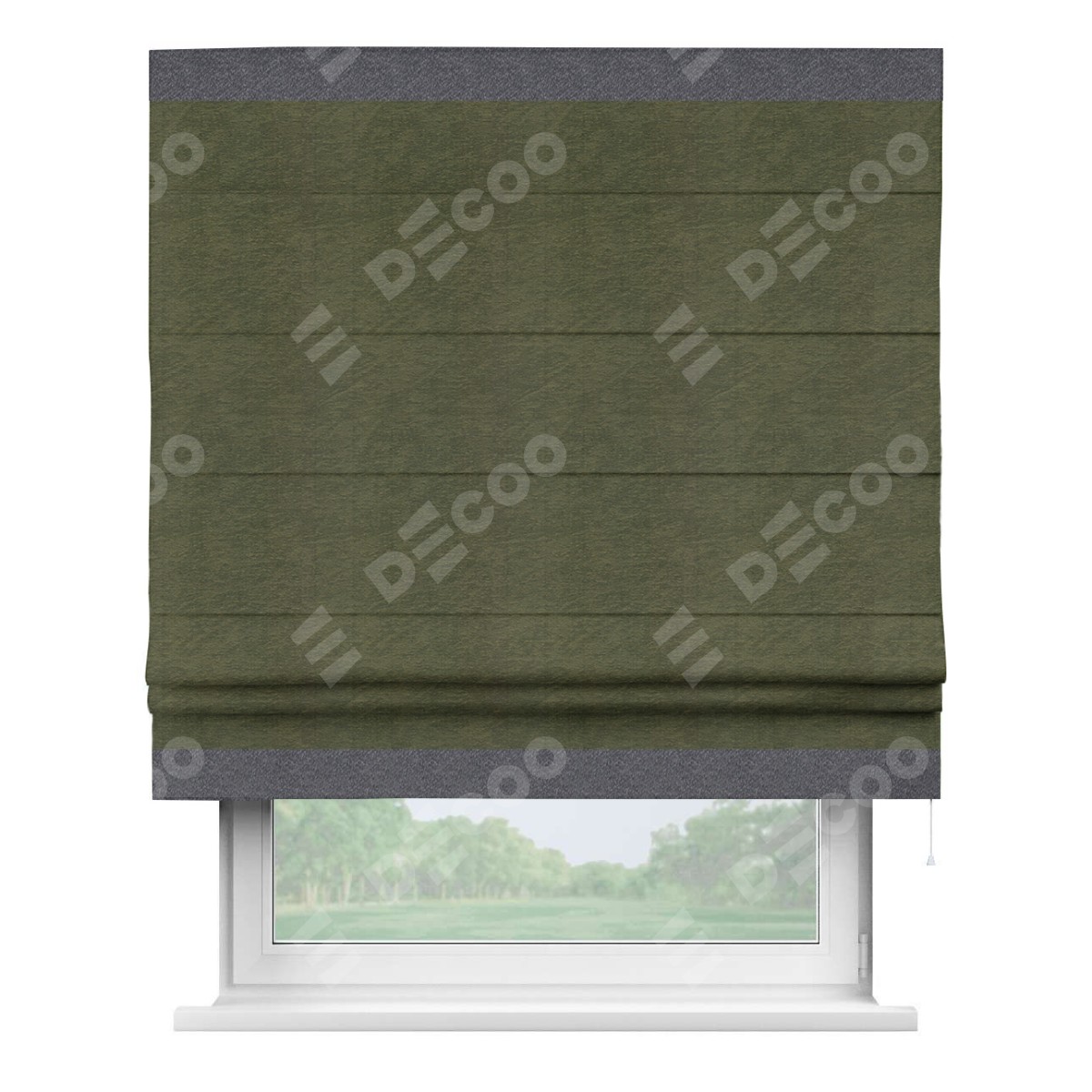 Римская штора производителя «Cortin», используется для проёма, пошита из ткани софт однотонный зелёный, артикул 33110. Отделка шторы кантом «Горизонт», ткань для канта используется из софта разной расцветки на выбор. Имеет универсальный механизм и подходит для монтажа: на потолок, на стену и в нишу.