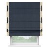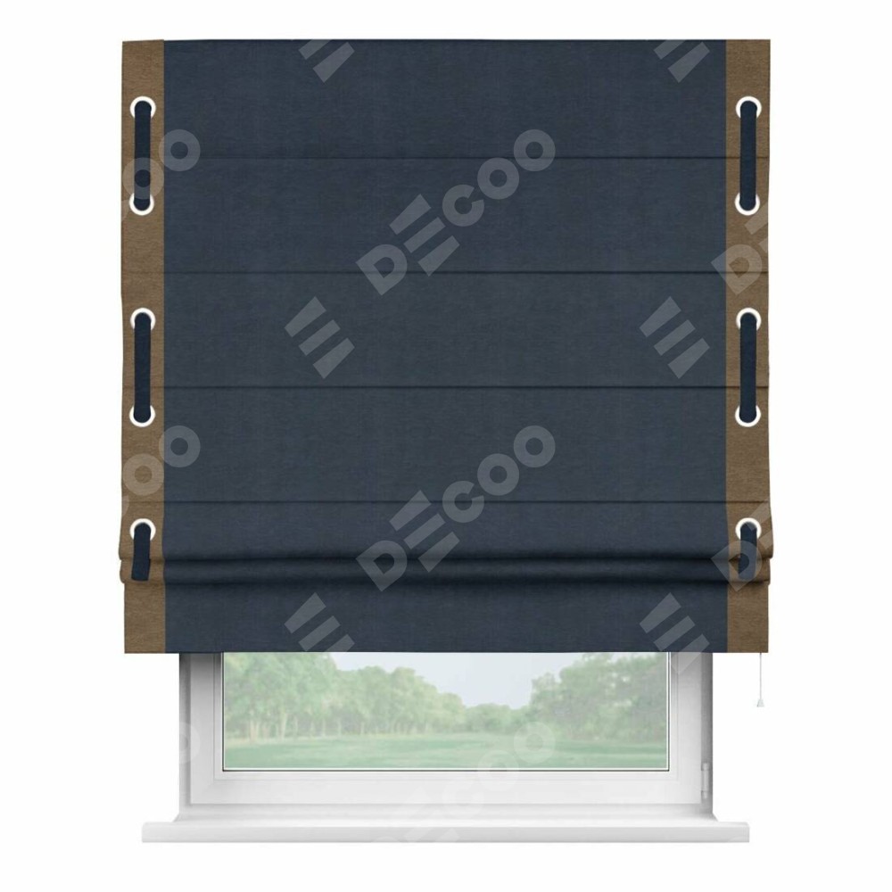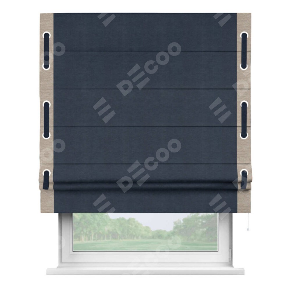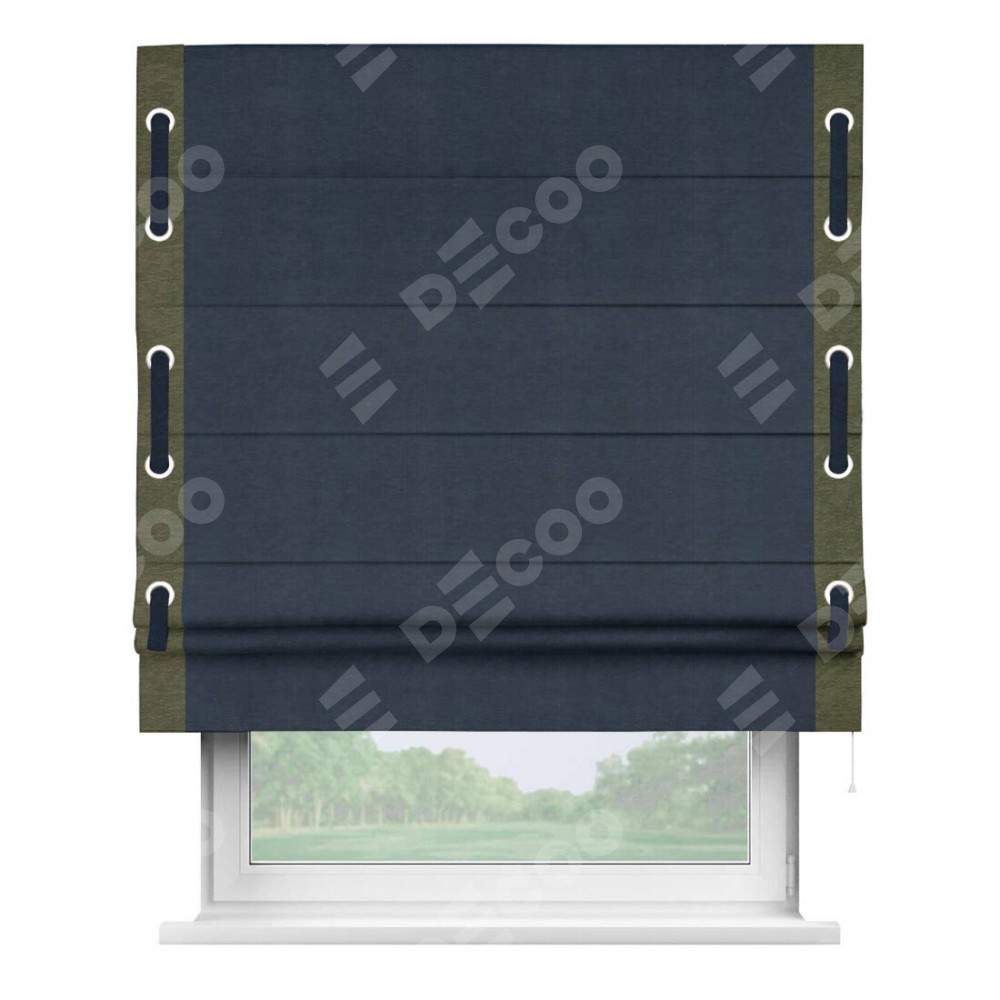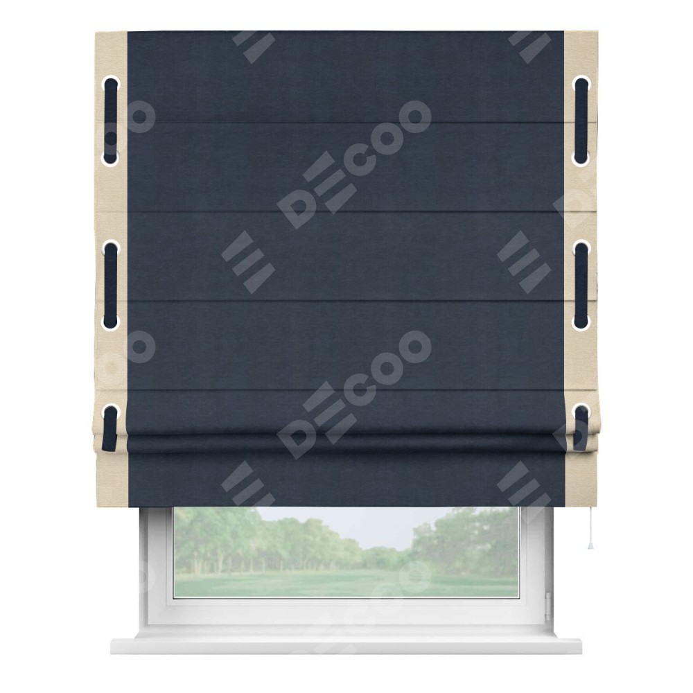 Римская штора производителя «Cortin», используется для проёма, пошита из ткани софт однотонный тёмно-синий, артикул 33111. Отделка шторы кантом «Стрим Дуо» на кантах расположены люверсы с пояском, ткань для канта используется из софта разной расцветки на выбор. Ткань для пояска обычно используется из основной ткани шторы, а так же можно сделать из любой расцветки по желанию. Имеет универсальный механизм и подходит для монтажа: на потолок, на стену и в нишу.