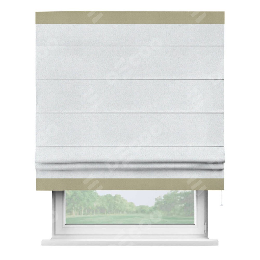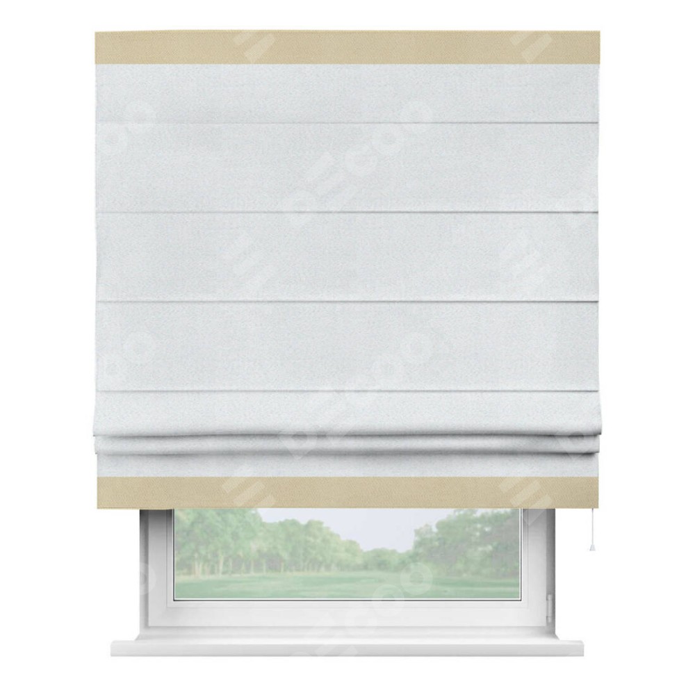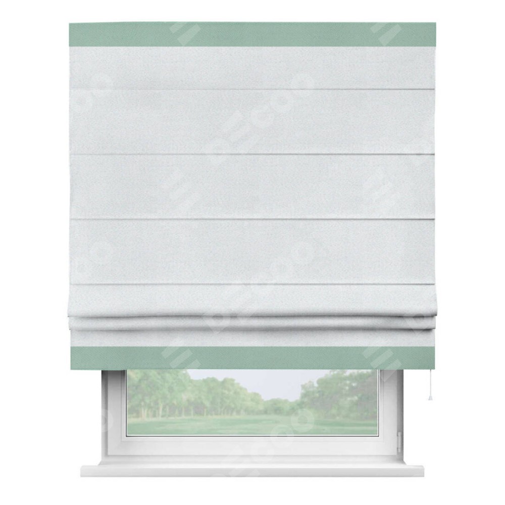 Римская штора производителя «Cortin», используется для проёма, пошита из ткани блэкаут однотонный дымчато-белый, артикул ткани 101. Отделка шторы кантом «Горизонт», ткань для канта используется из блэкаута однотонного разной расцветки на выбор. Имеет универсальный механизм и подходит для монтажа: на потолок, на стену и в нишу.