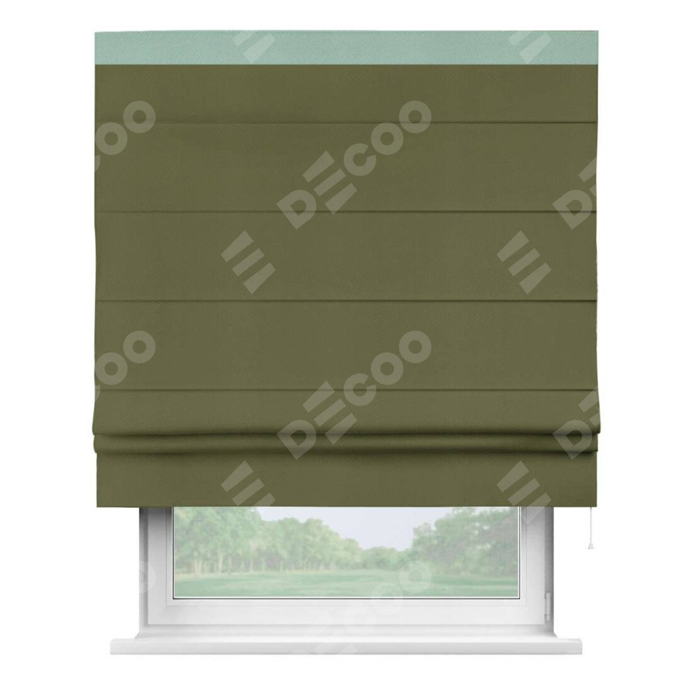 Римская штора производителя «Cortin», используется для проёма, пошита из ткани блэкаут однотонный зелёный, артикул ткани 81859. Отделка шторы кантом «Кинг», ткань для канта используется из блэкаута однотонного разной расцветки на выбор. Имеет универсальный механизм и подходит для монтажа: на потолок, на стену и в нишу.