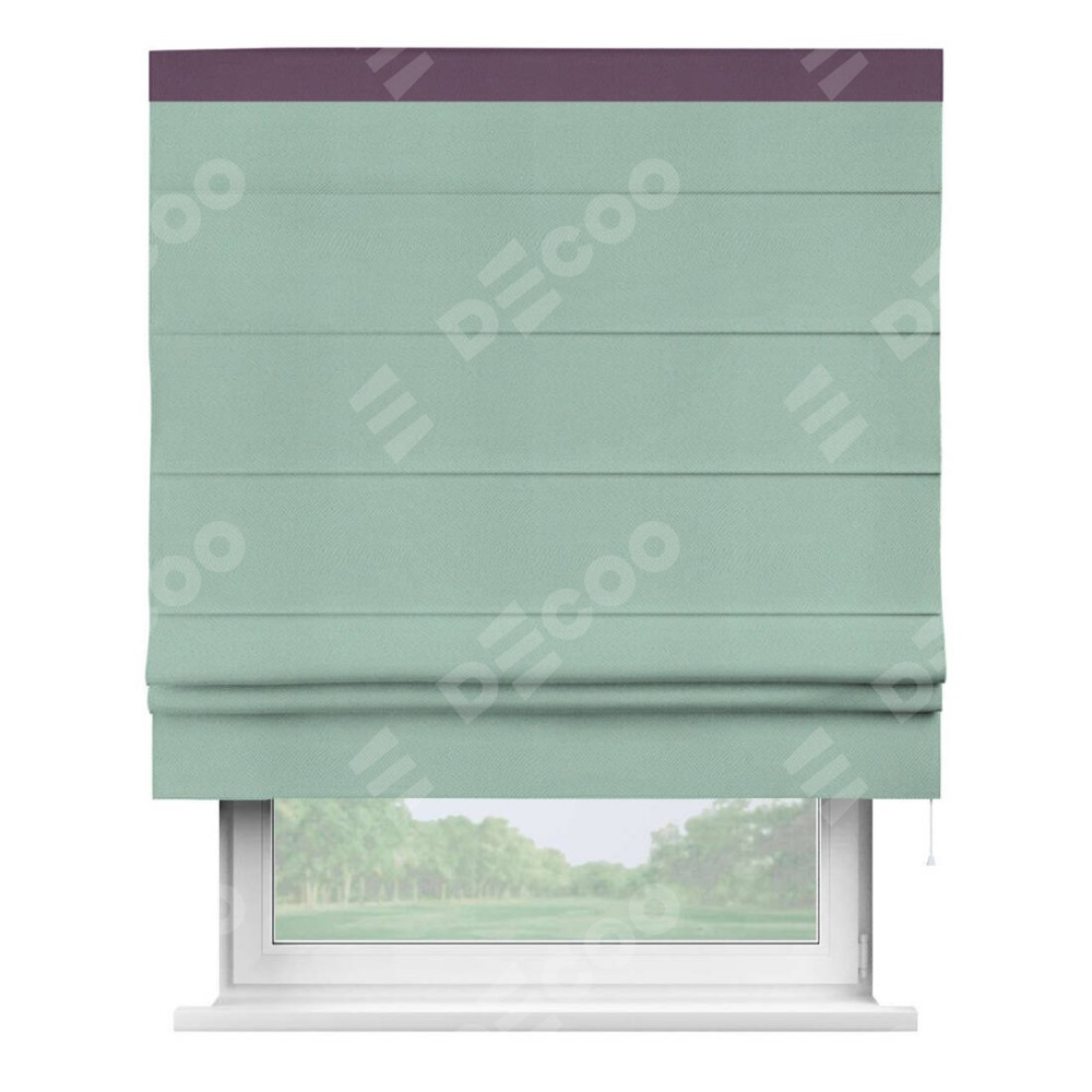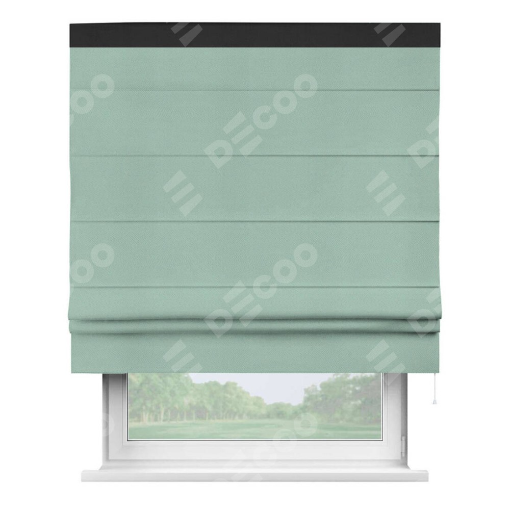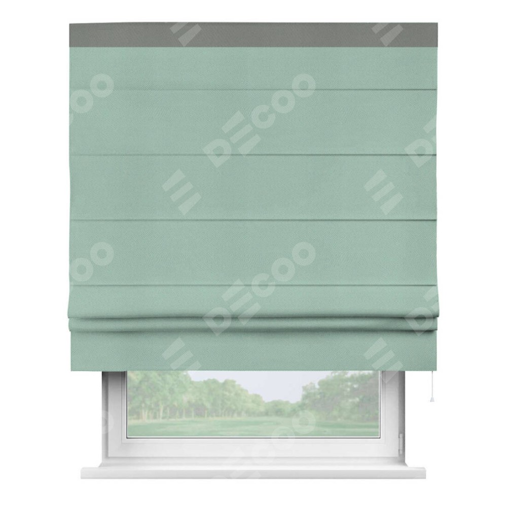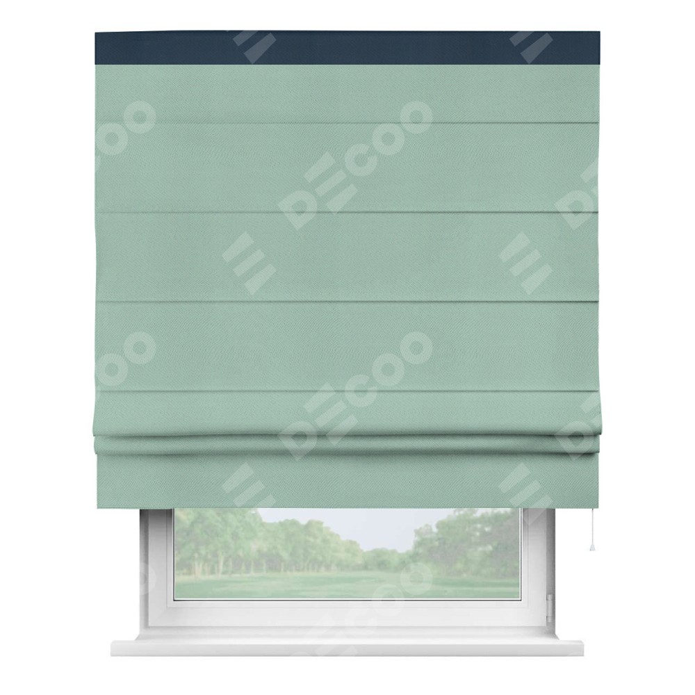 Римская штора производителя «Cortin», используется для проёма, пошита из ткани блэкаут однотонный ментоловый, артикул ткани 29584. Отделка шторы кантом «Кинг», ткань для канта используется из блэкаута однотонного разной расцветки на выбор. Имеет универсальный механизм и подходит для монтажа: на потолок, на стену и в нишу.