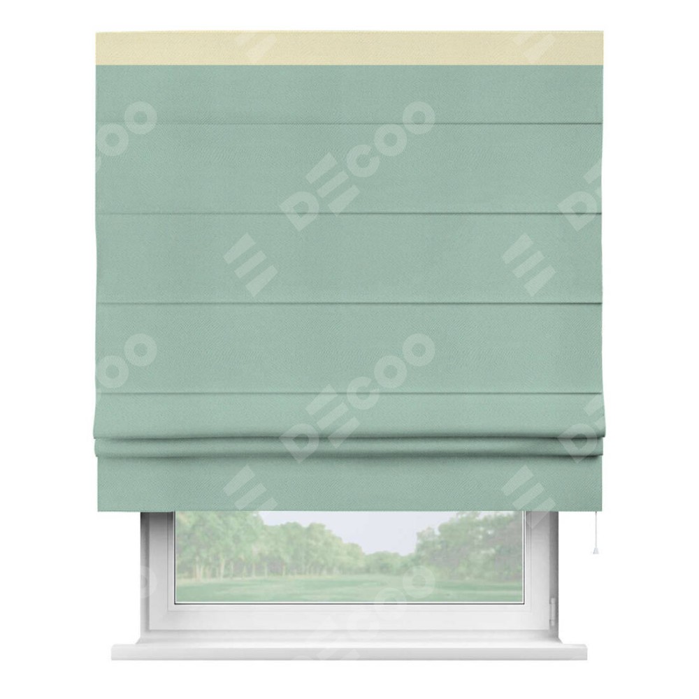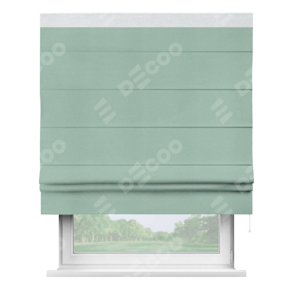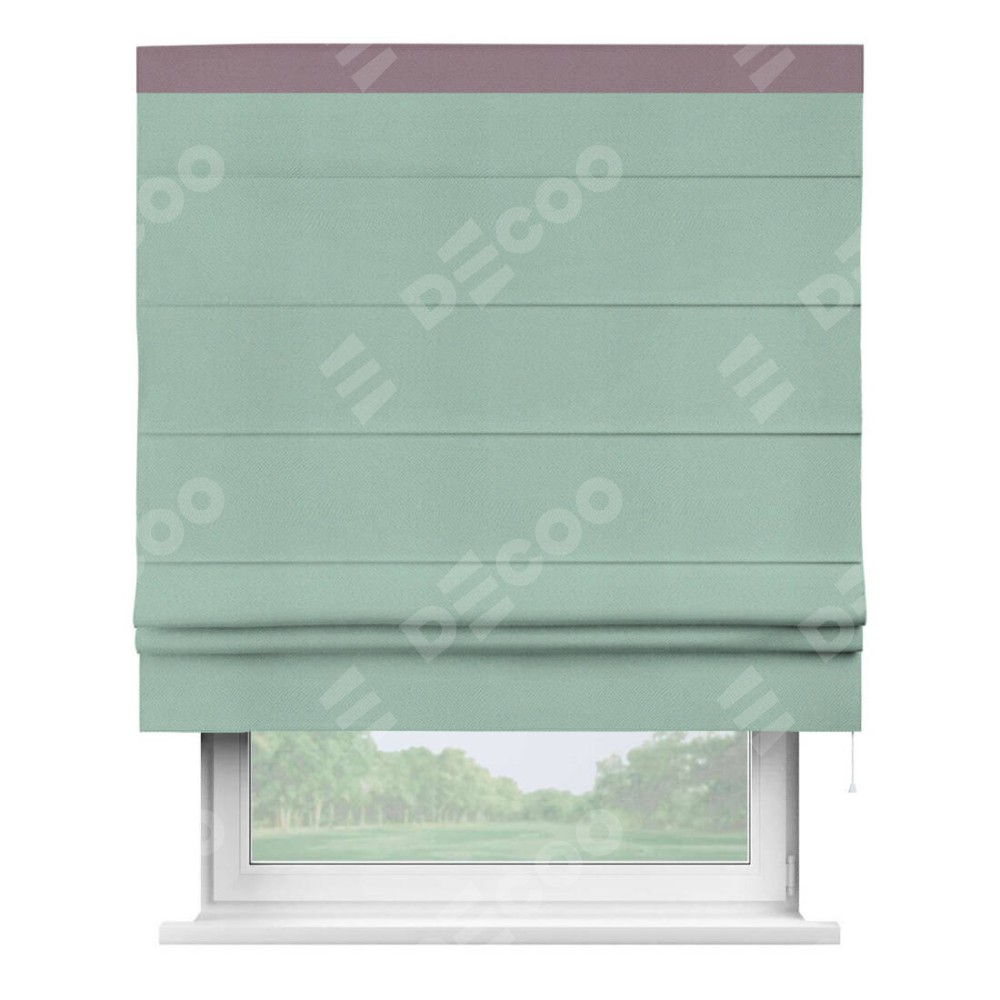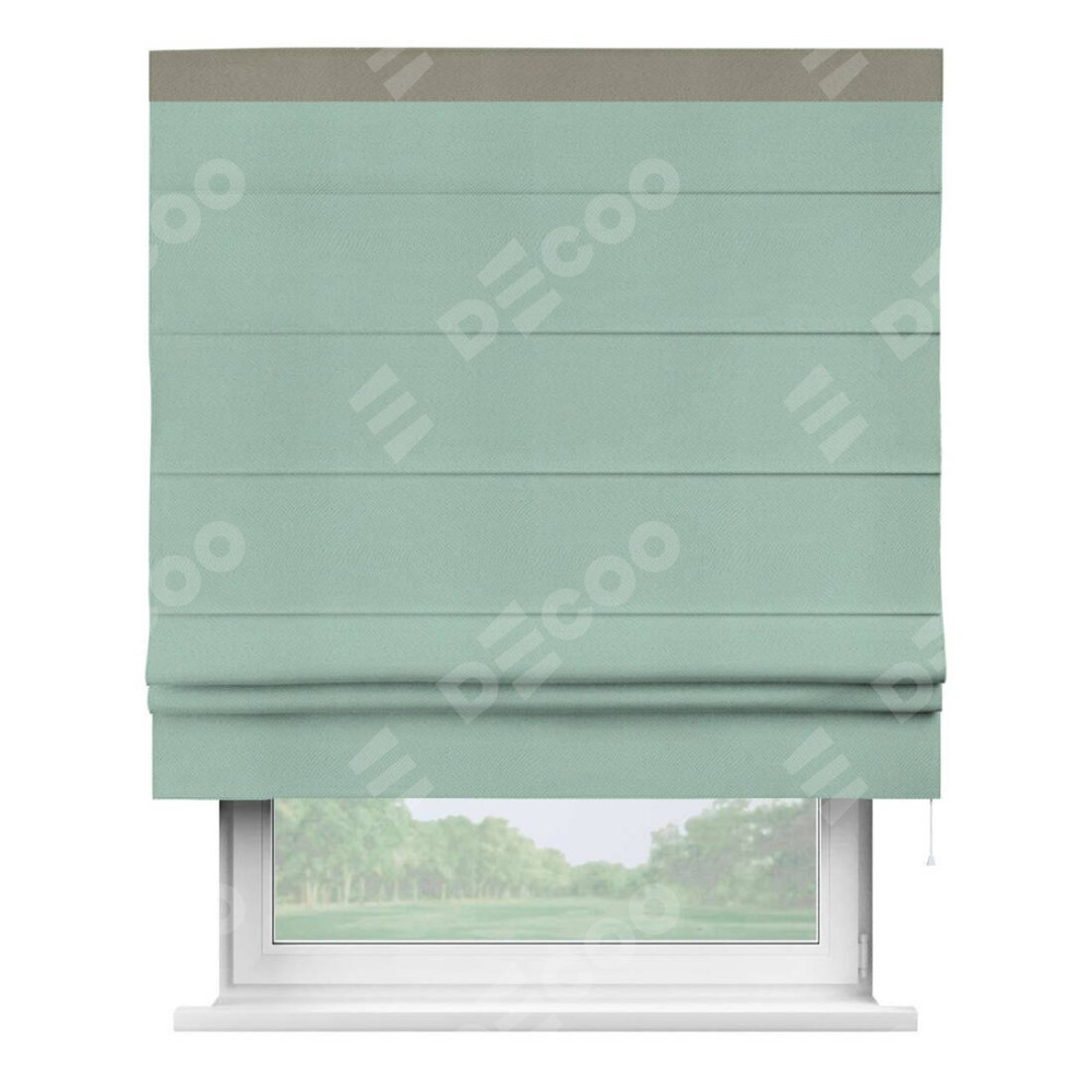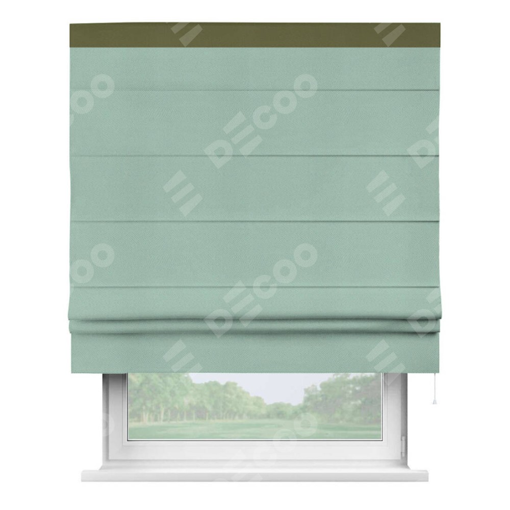 Римская штора производителя «Cortin», используется для проёма, пошита из ткани блэкаут однотонный ментоловый, артикул ткани 29584. Отделка шторы кантом «Кинг», ткань для канта используется из блэкаута однотонного разной расцветки на выбор. Имеет универсальный механизм и подходит для монтажа: на потолок, на стену и в нишу.