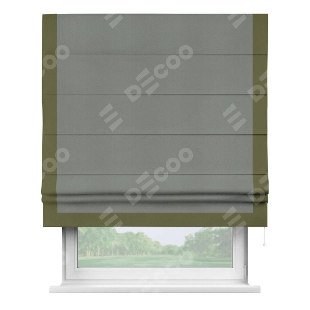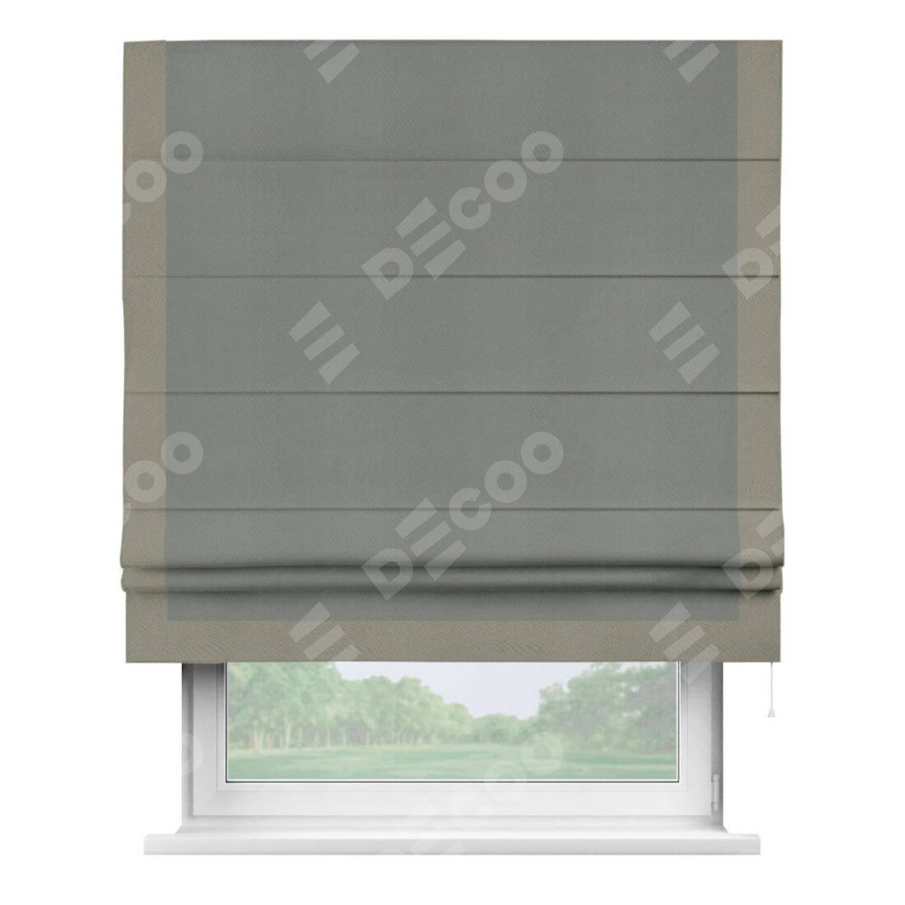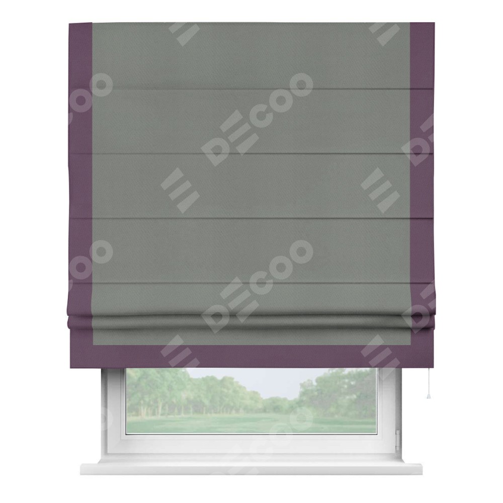 Римская штора производителя «Cortin», используется для проёма, пошита из ткани блэкаут однотонный тёмно-серый, артикул ткани 18077. Отделка шторы кантом «Виктория», ткань для канта используется из блэкаута однотонного разной расцветки на выбор. Имеет универсальный механизм и подходит для монтажа: на потолок, на стену и в нишу.