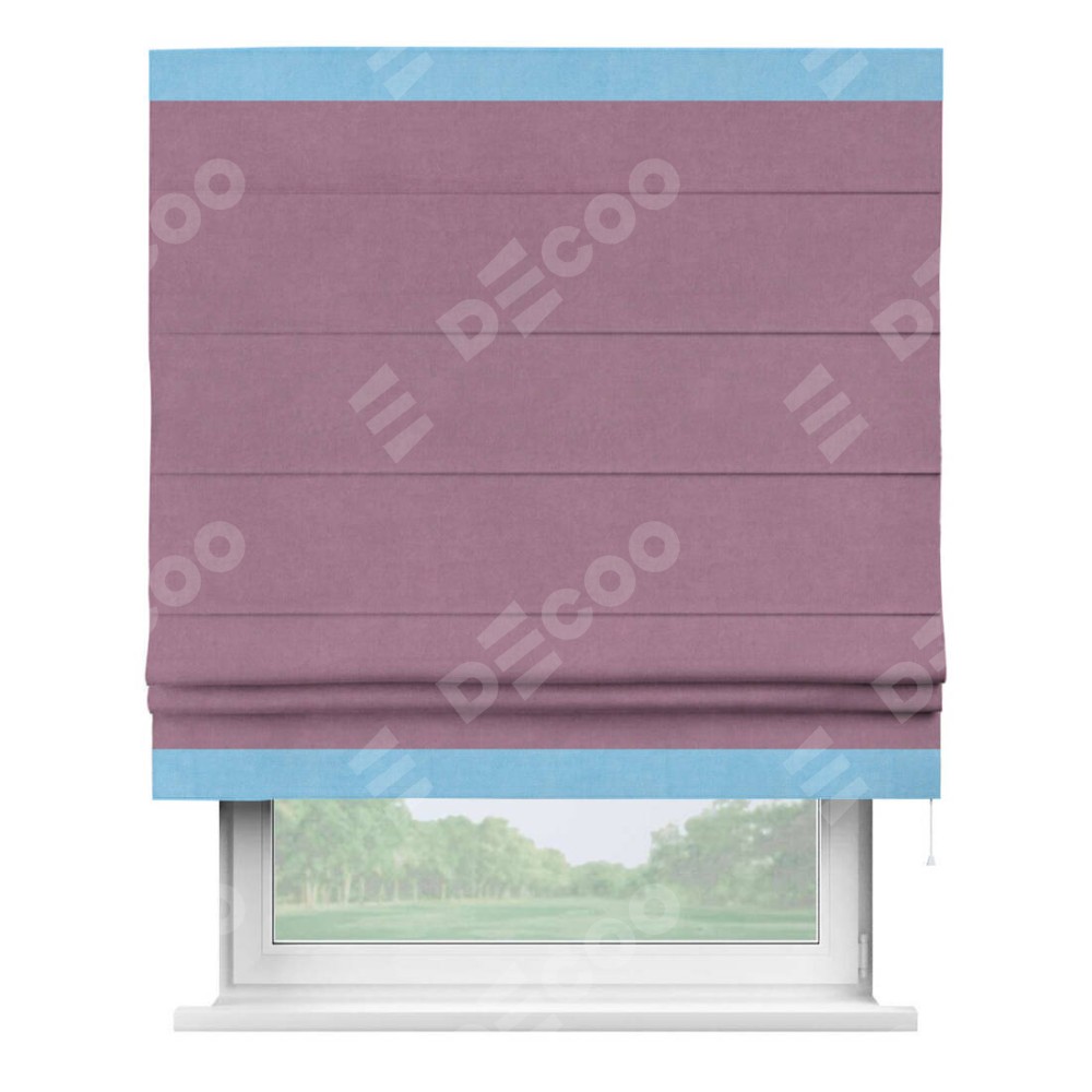 Римская штора производителя «Cortin», используется для проёма, пошита из ткани вельвет лиловый, артикул ткани 17752. Отделка шторы кантом «Горизонт», ткань для канта используется из вельвета разной расцветки на выбор. Имеет универсальный механизм и подходит для монтажа: на потолок, на стену и в нишу.