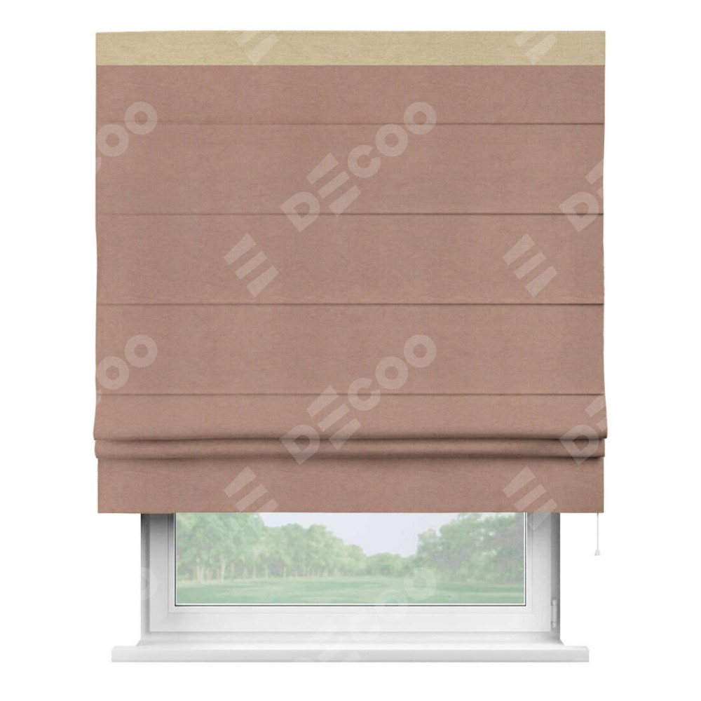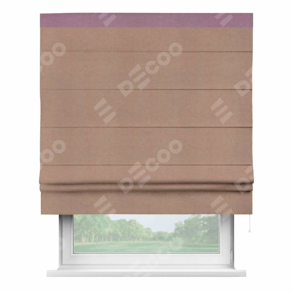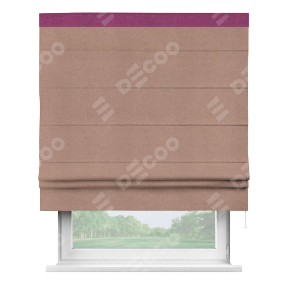 Римская штора производителя «Cortin», используется для проёма, пошита из ткани вельвет брусничный джем, артикул ткани 17750. Отделка шторы кантом «Кинг», ткань для канта используется из вельвета разной расцветки на выбор. Имеет универсальный механизм и подходит для монтажа: на потолок, на стену и в нишу.