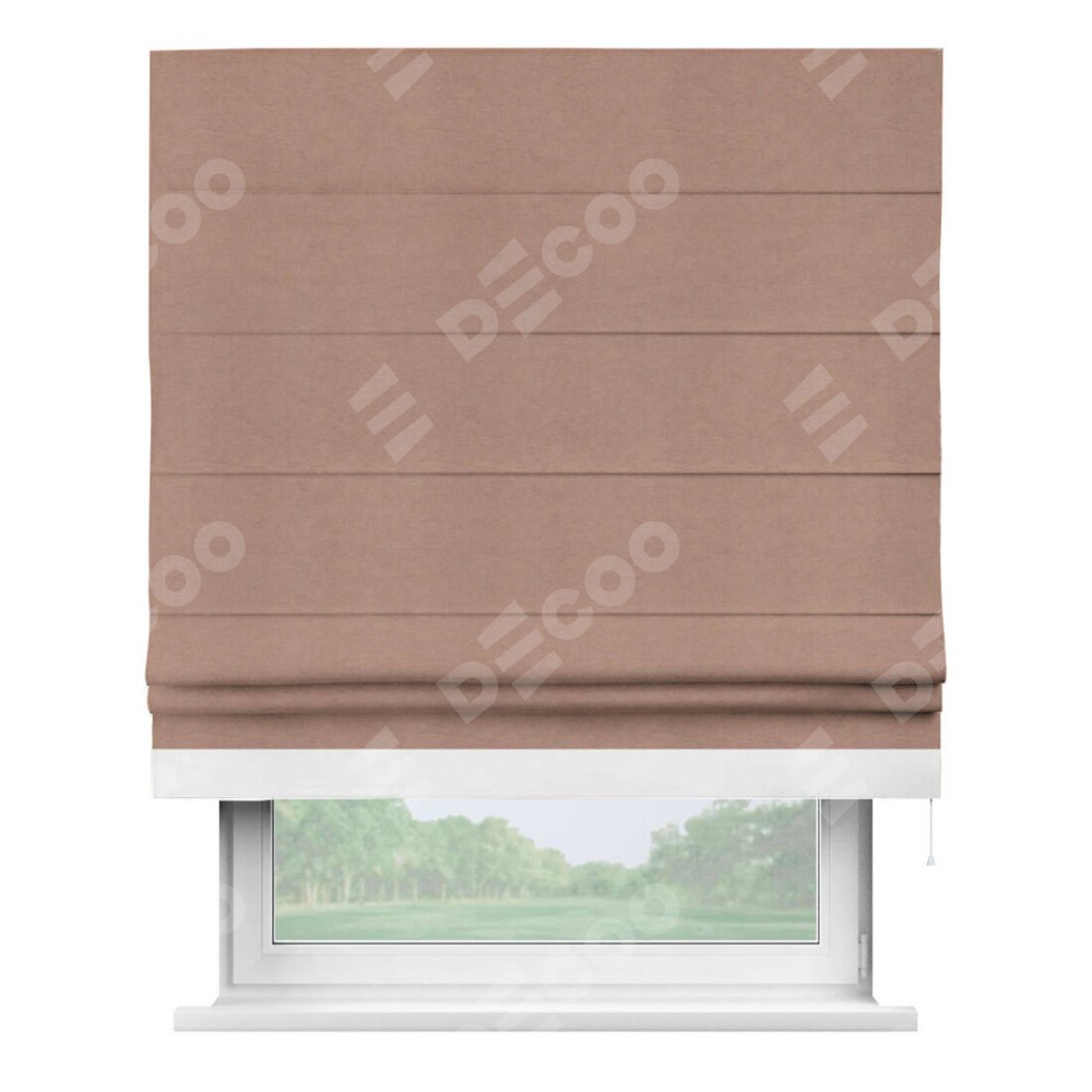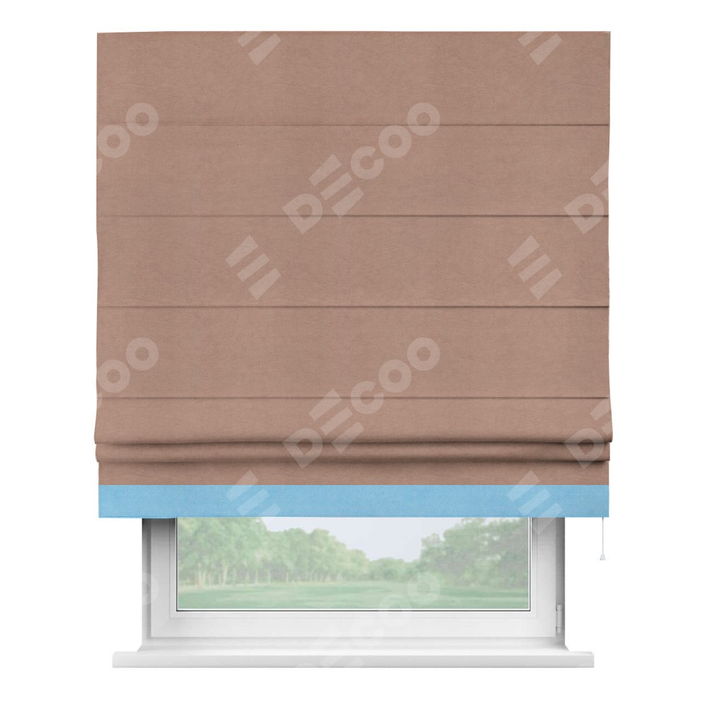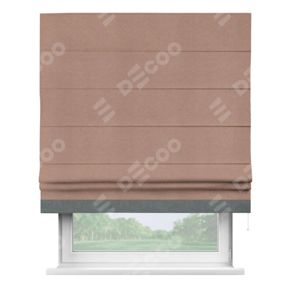 Римская штора производителя «Cortin», используется для проёма, пошита из ткани вельвет брусничный джем, артикул ткани 17750. Отделка шторы кантом «Джестер», ткань для канта используется из вельвета разной расцветки на выбор. Имеет универсальный механизм и подходит для монтажа: на потолок, на стену и в нишу.