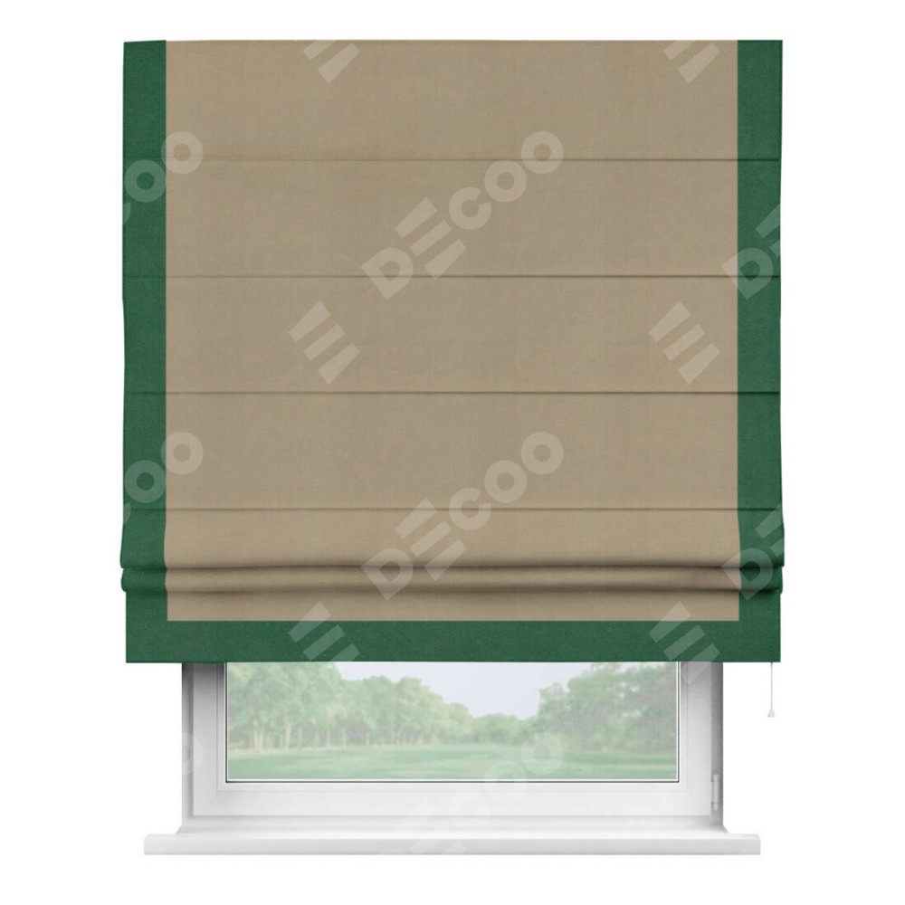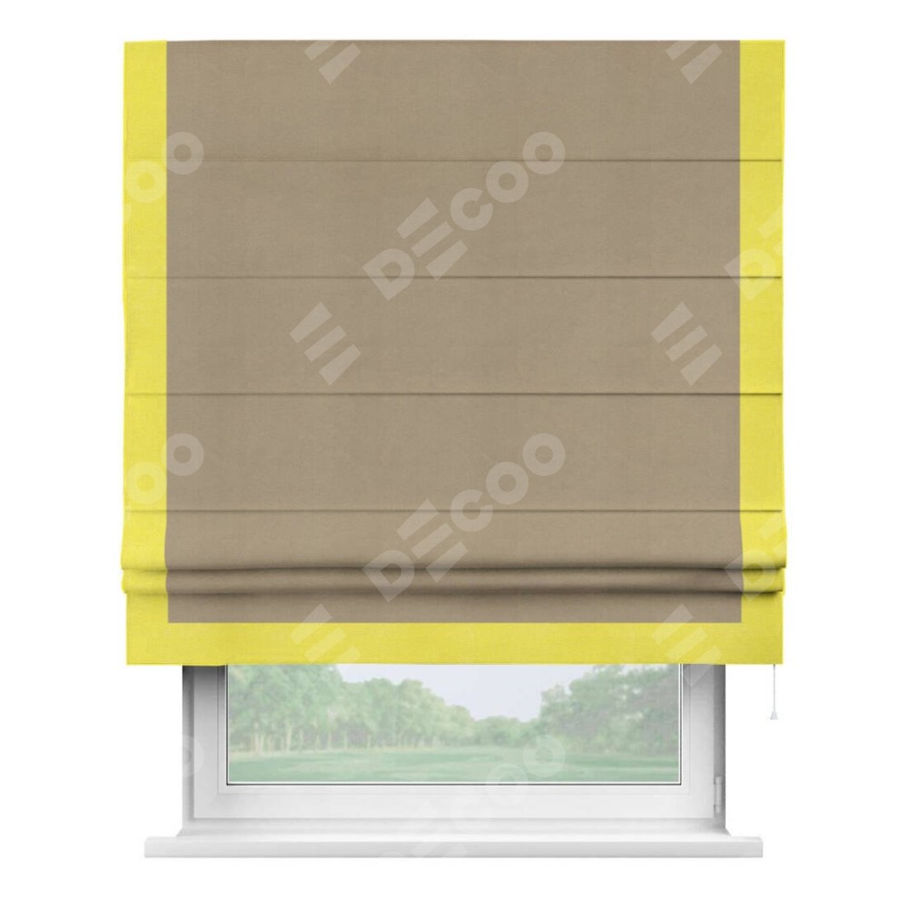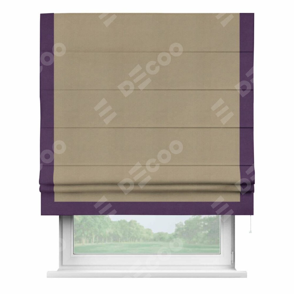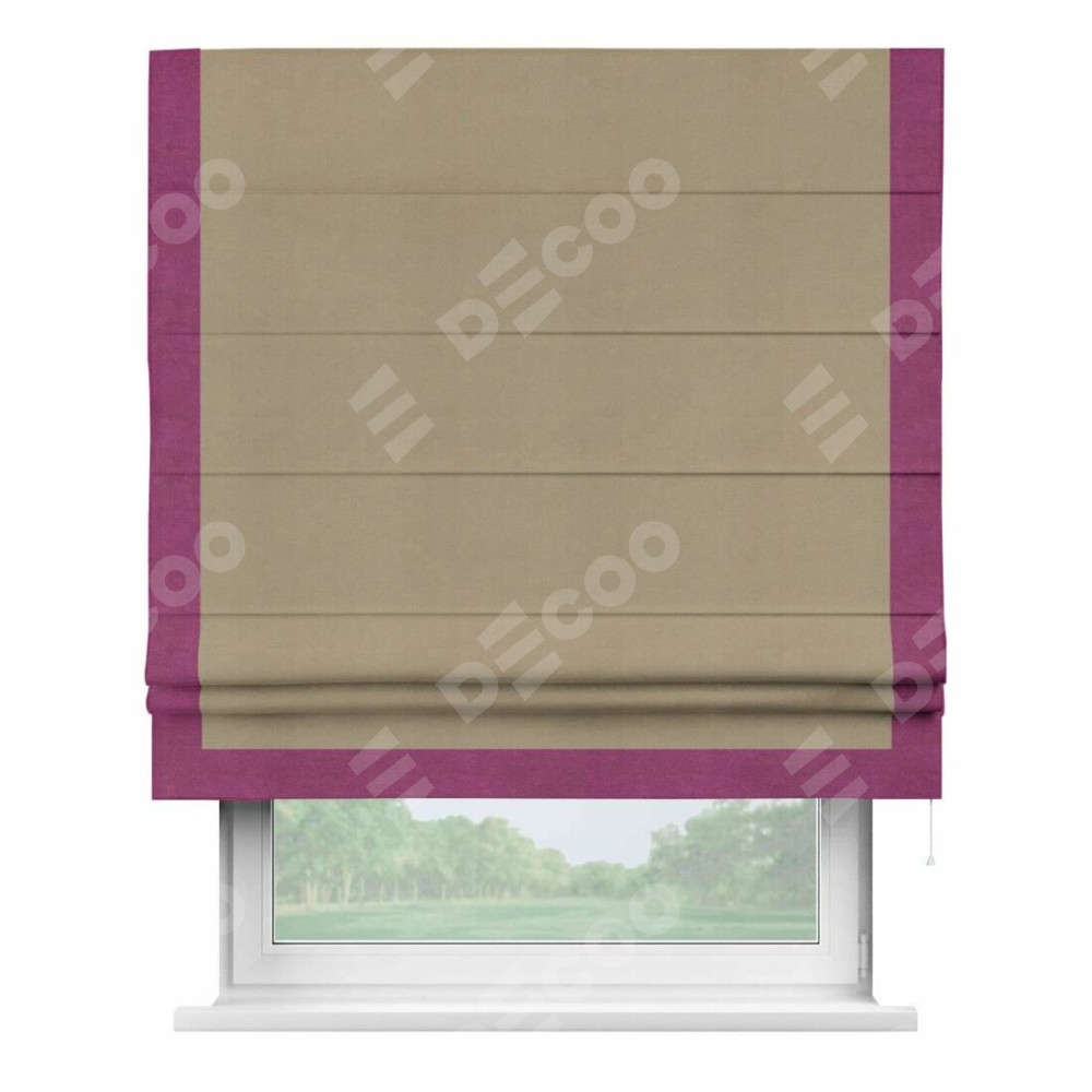 Римская штора производителя «Cortin», используется для проёма, пошита из ткани вельвет кофейный, артикул ткани 30980. Отделка шторы кантом «Виктория», ткань для канта используется из вельвета разной расцветки на выбор. Имеет универсальный механизм и подходит для монтажа: на потолок, на стену и в нишу.