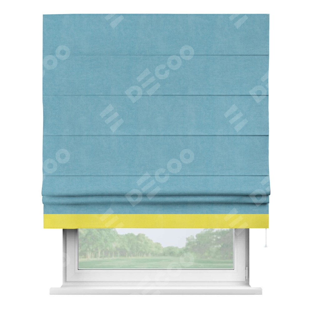 Римская штора производителя «Cortin», используется для проёма, пошита из ткани вельвет ментоловый, артикул ткани 10443. Отделка шторы кантом «Джестер», ткань для канта используется из вельвета разной расцветки на выбор. Имеет универсальный механизм и подходит для монтажа: на потолок, на стену и в нишу.